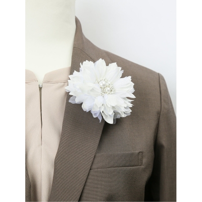■セレモニーやパーティーなど、フォーマルシーンのスーツスタイルに欠かせないコサージュです。立体感のあるフラワーモチーフのコサージュに、人工パールをあしらって華やかな雰囲気に仕上げています。コサージュを添えるとそれだけでイメージアップ、胸もとのアクセントとして大活躍してくれます。
