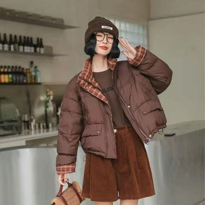 ショートダウンジャケット レディース チェック見返し スタンドネック