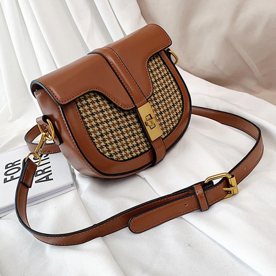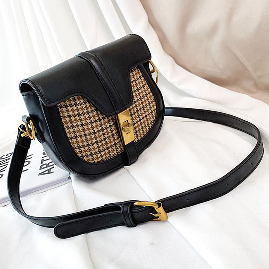 上品な千鳥柄にフェイクレザー素材が大人っぽさをプラス。