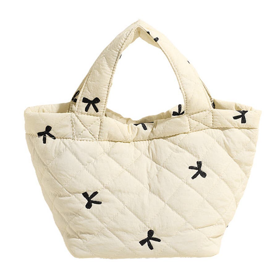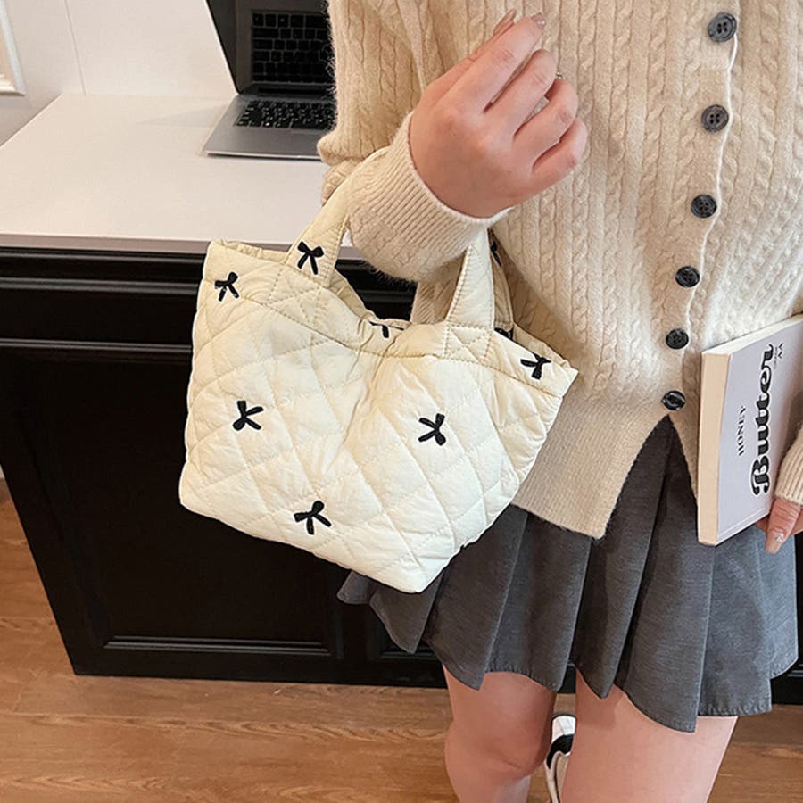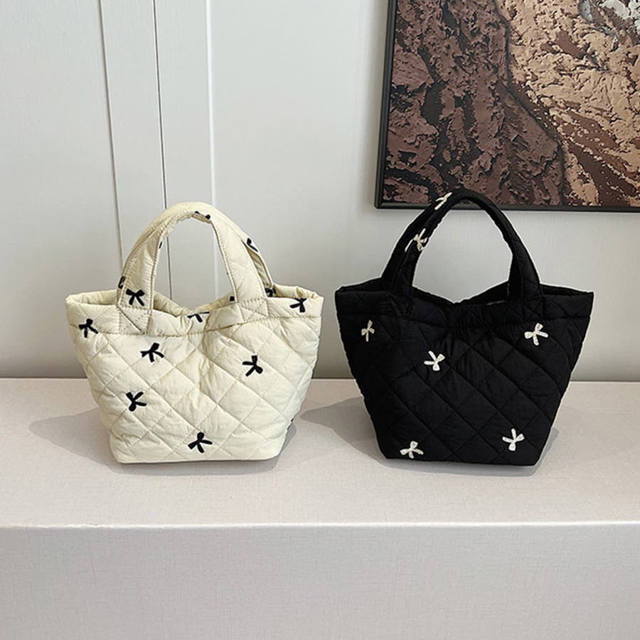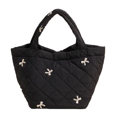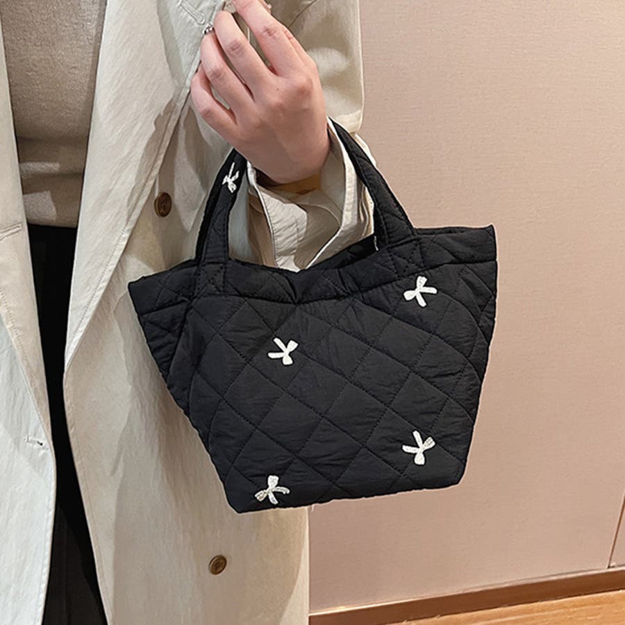 軽量で持ち歩きやすいキルティング生地に、リボン柄の刺繍が散りばめられた大人可愛いトートバッグ。