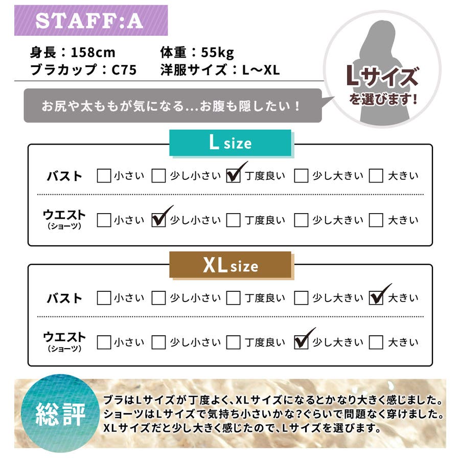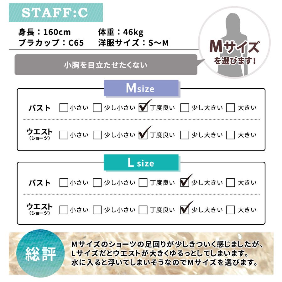 投稿日:2022.08.21前からはもちろん後ろ姿もとっても可愛く、旦那さんからも高評価でした。水着のトップスは、カップが大きめですが、ヌーブラをセットするといい感じに盛れました。タンキニの方はぴったりでした。おへそまでかくれるので、海でもぽこっと出た下腹を気にせずにはしゃげました笑