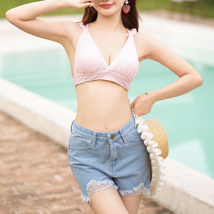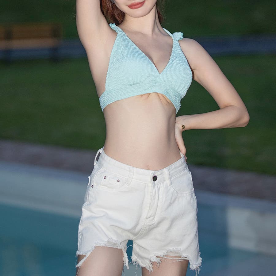 | 素材 | ビキニ: 82% ポリエステル, 18% ポリウレタン; デニムショートパンツ: 70% コットン, 28% ポリエステル, 2% ポリウレタン |