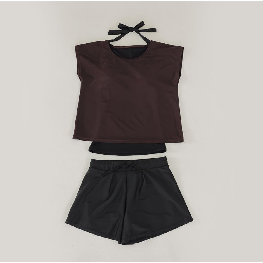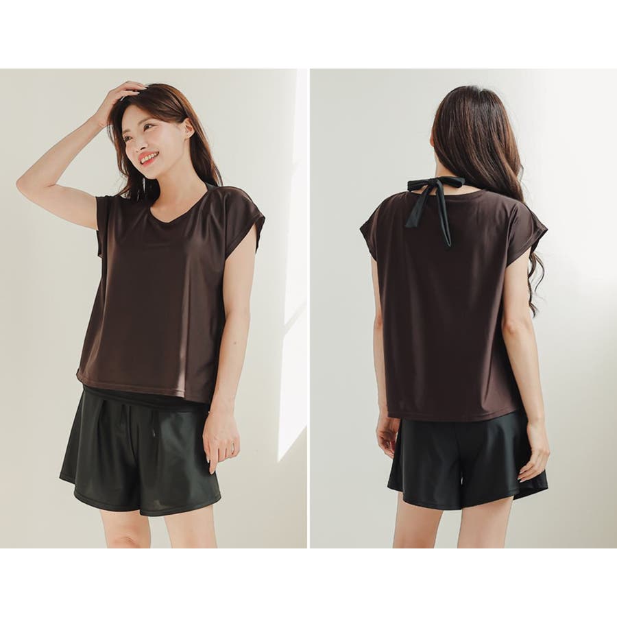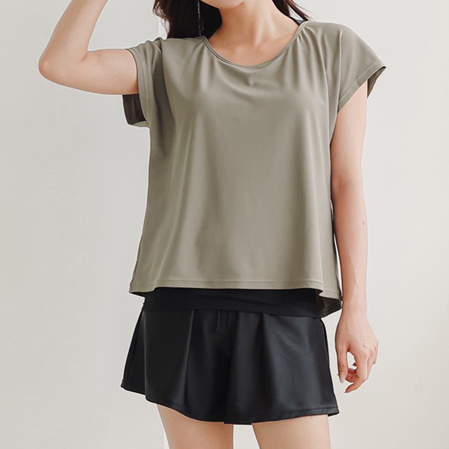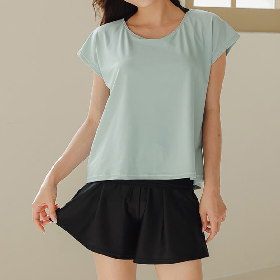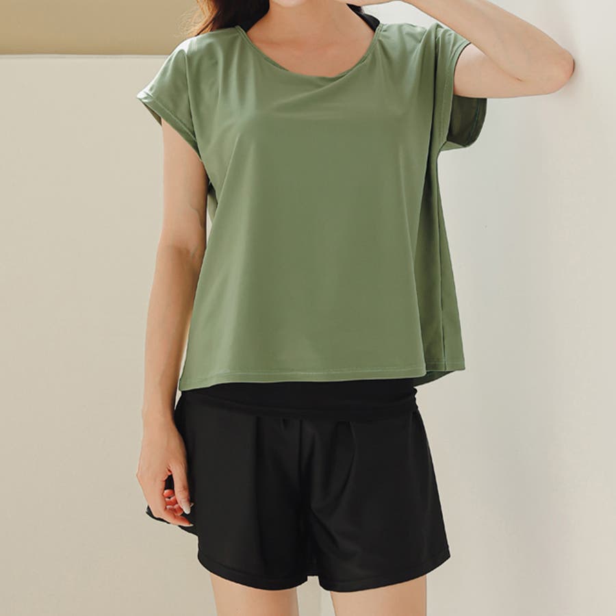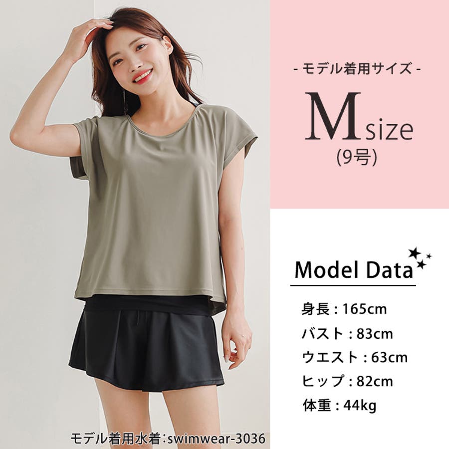 ラッシュガードとも合わせやすいシンプルさで紫外線対策も体型カバーもオシャレにこなせます♪