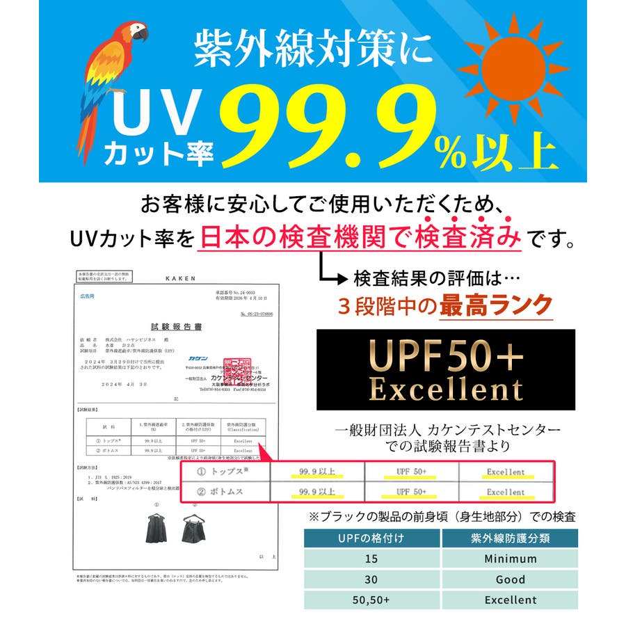 紫外線遮蔽率・UPFを日本の試験機関にて検査済みです。