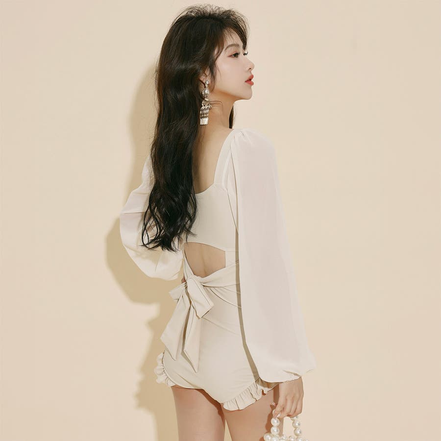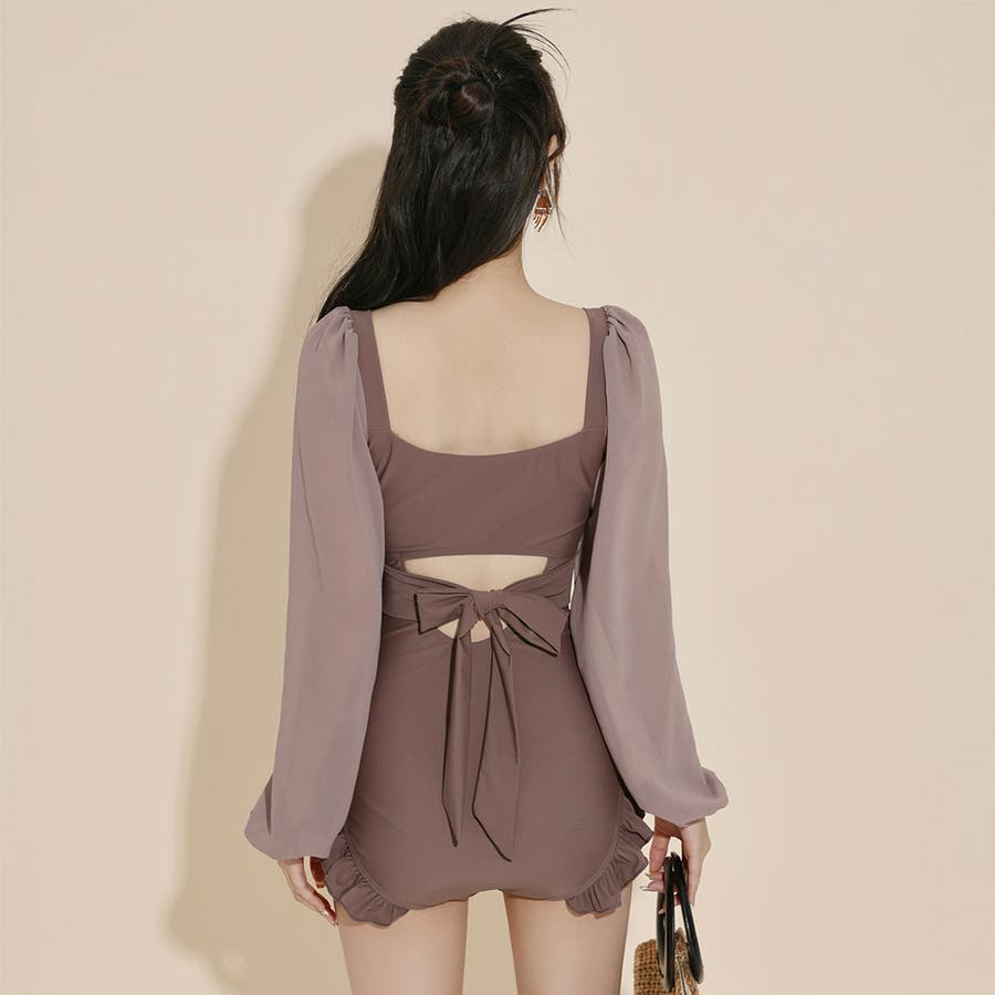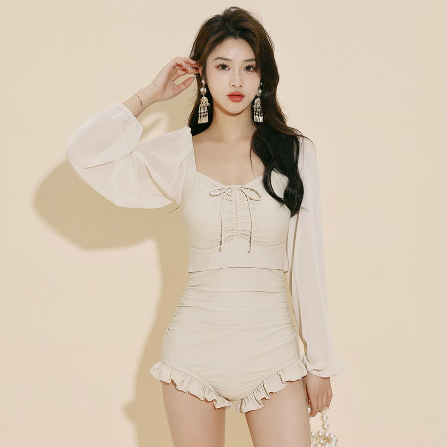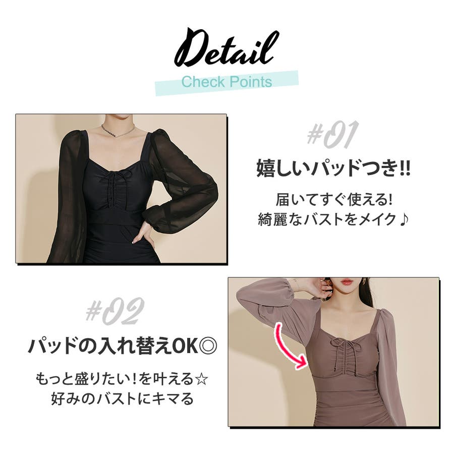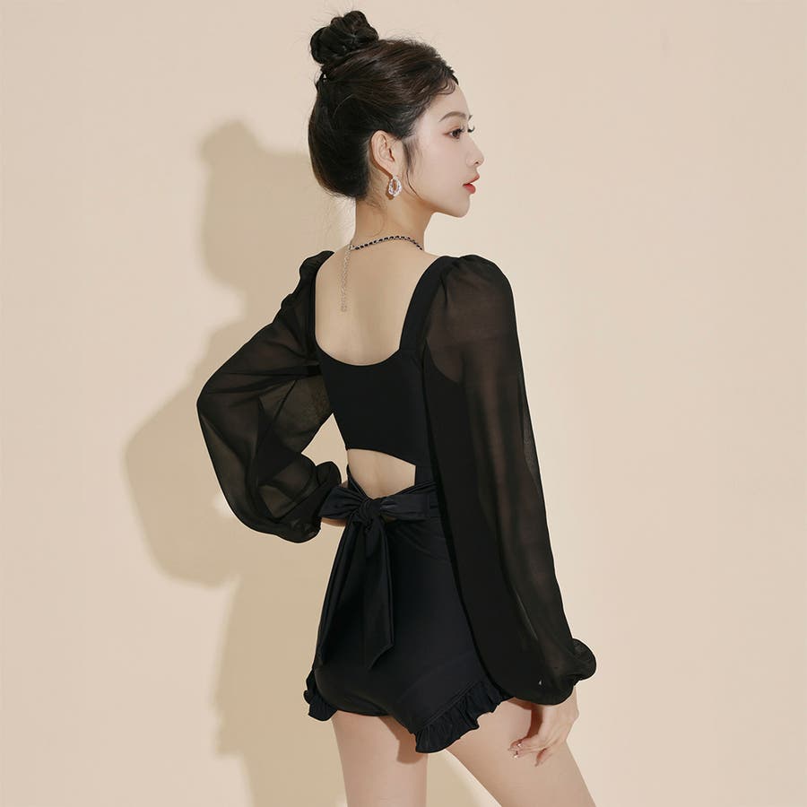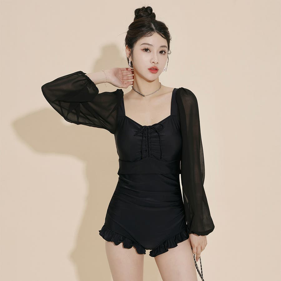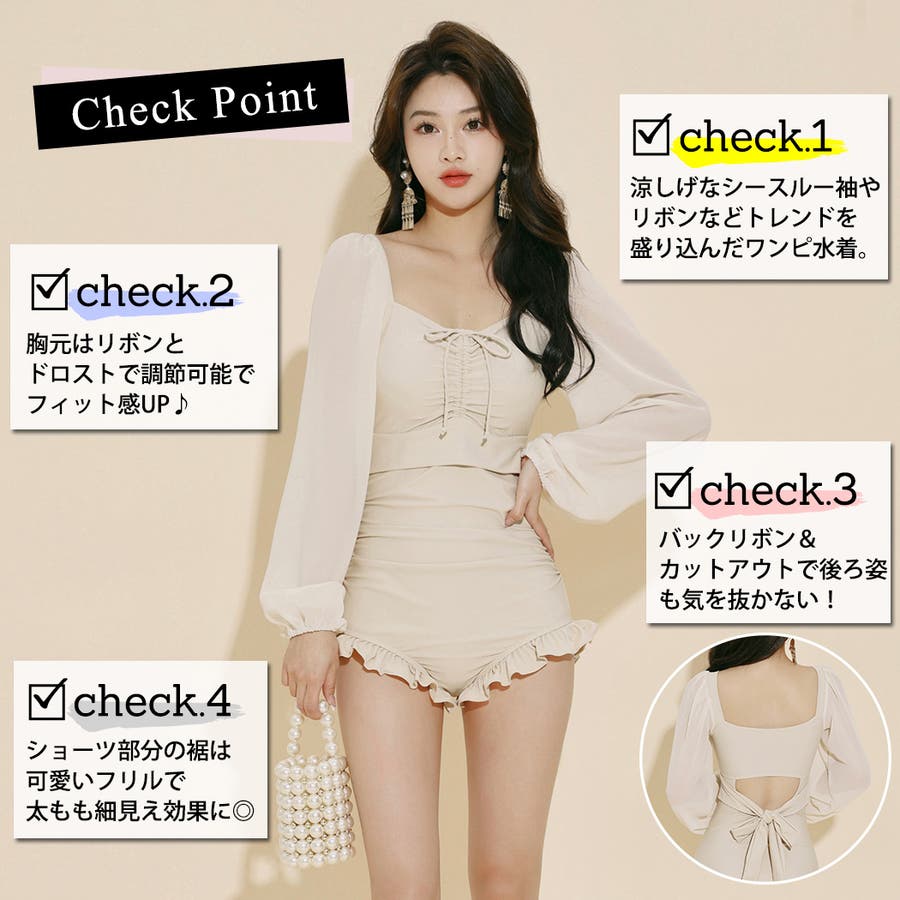 涼しげなシースルー袖やリボンなどトレンドを盛り込んだワンピ水着。