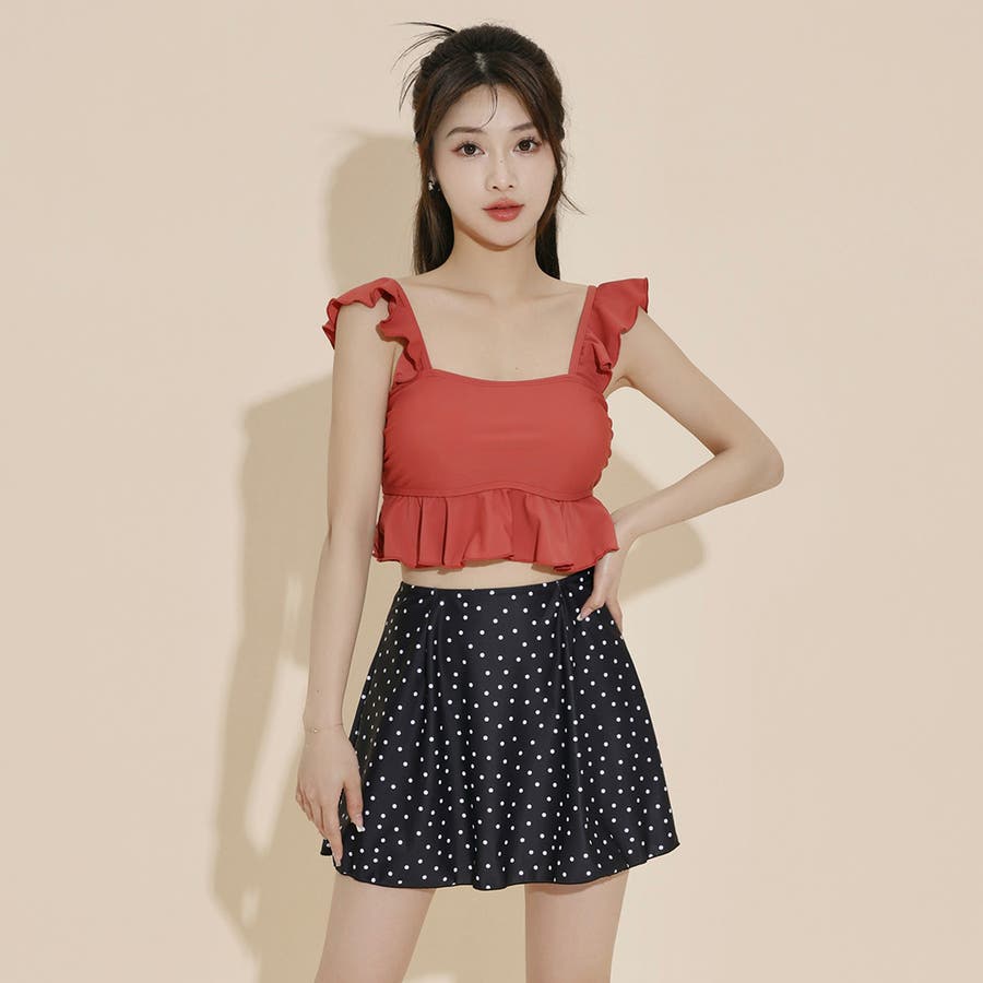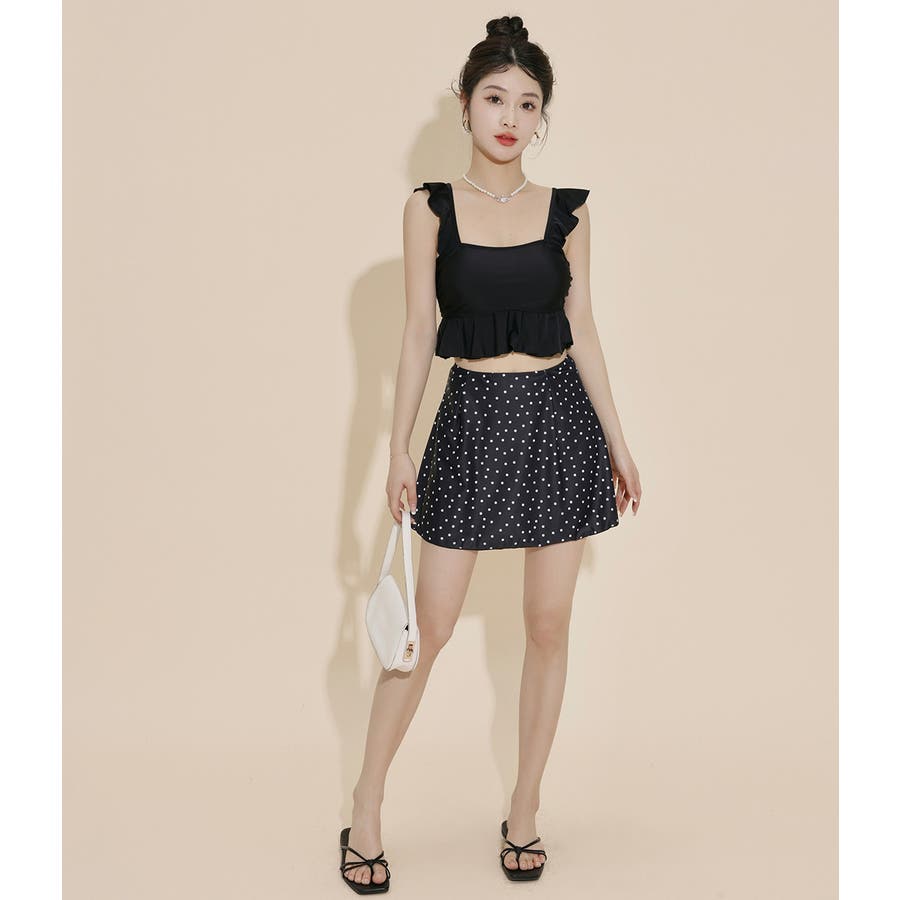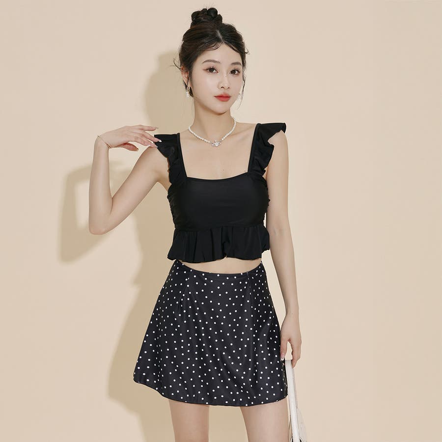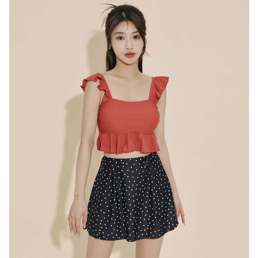 レトロチックな無地×ドット柄が可愛い3点セット水着。