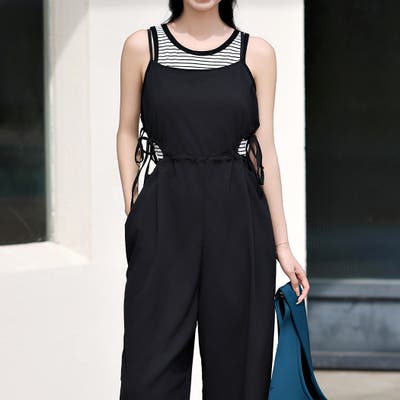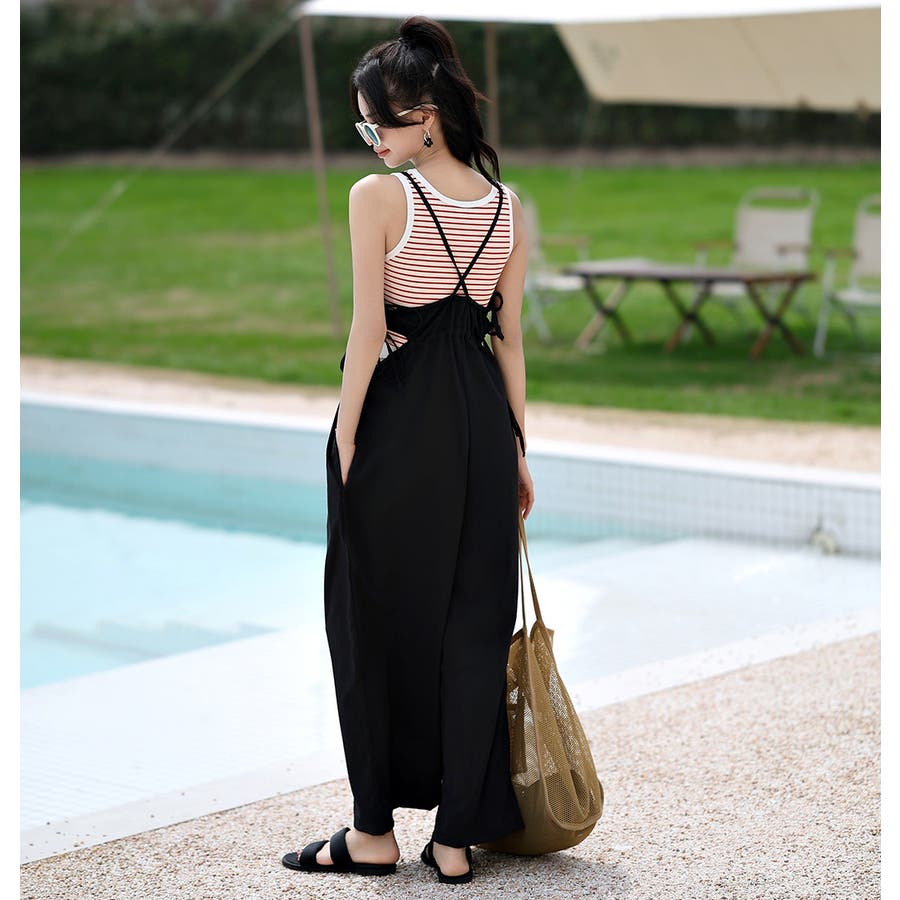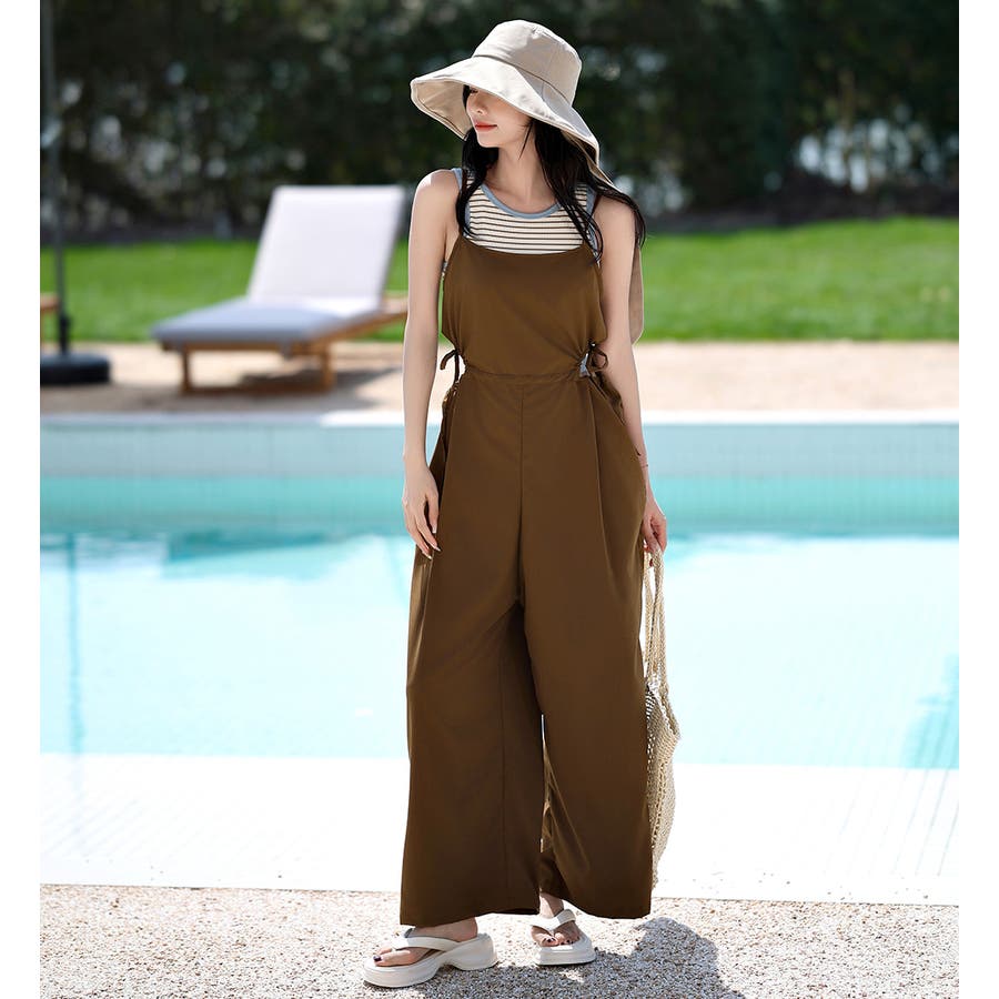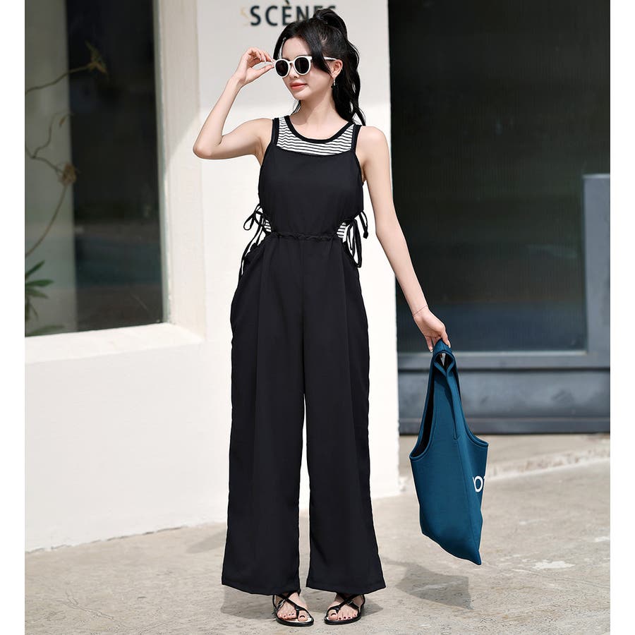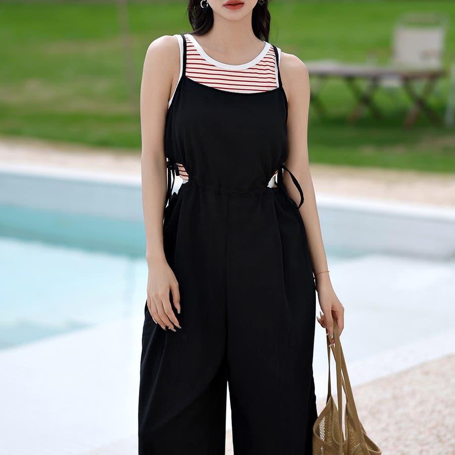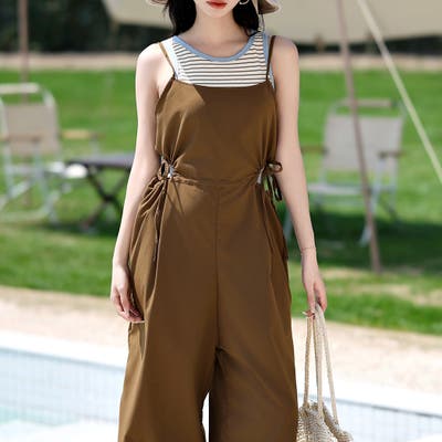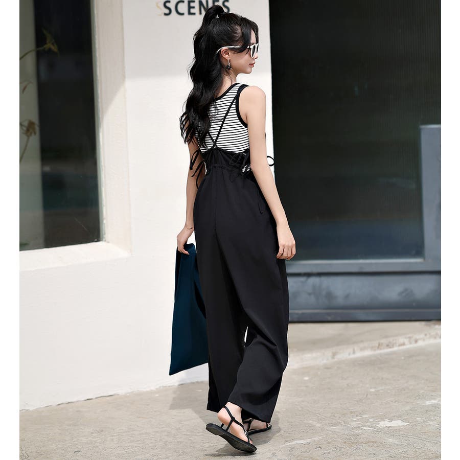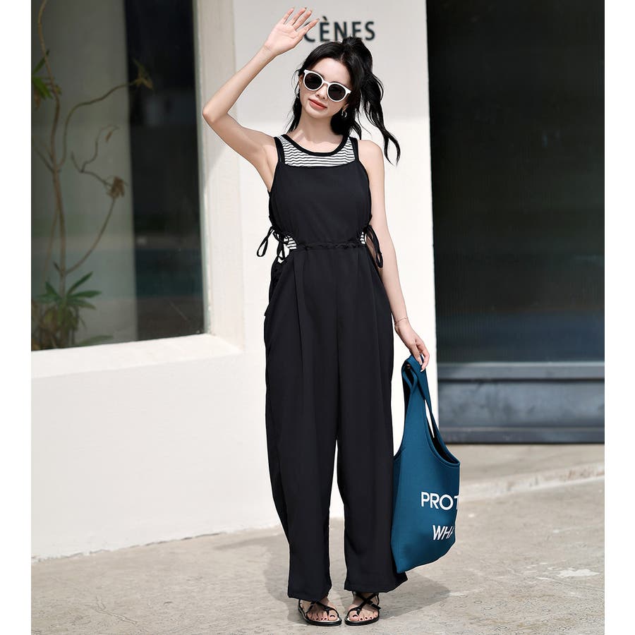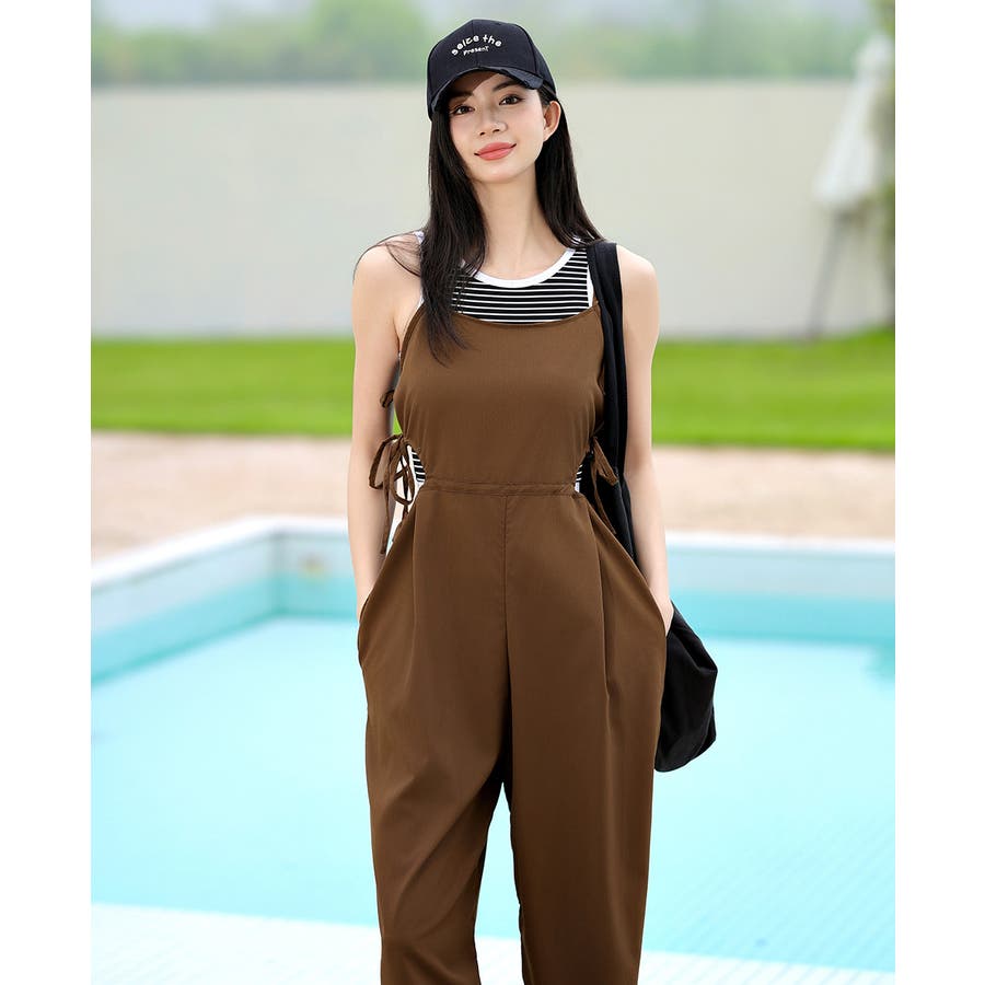 サロペットのアンダーは紐、ウエストは内側のドローコードで絞れる◎