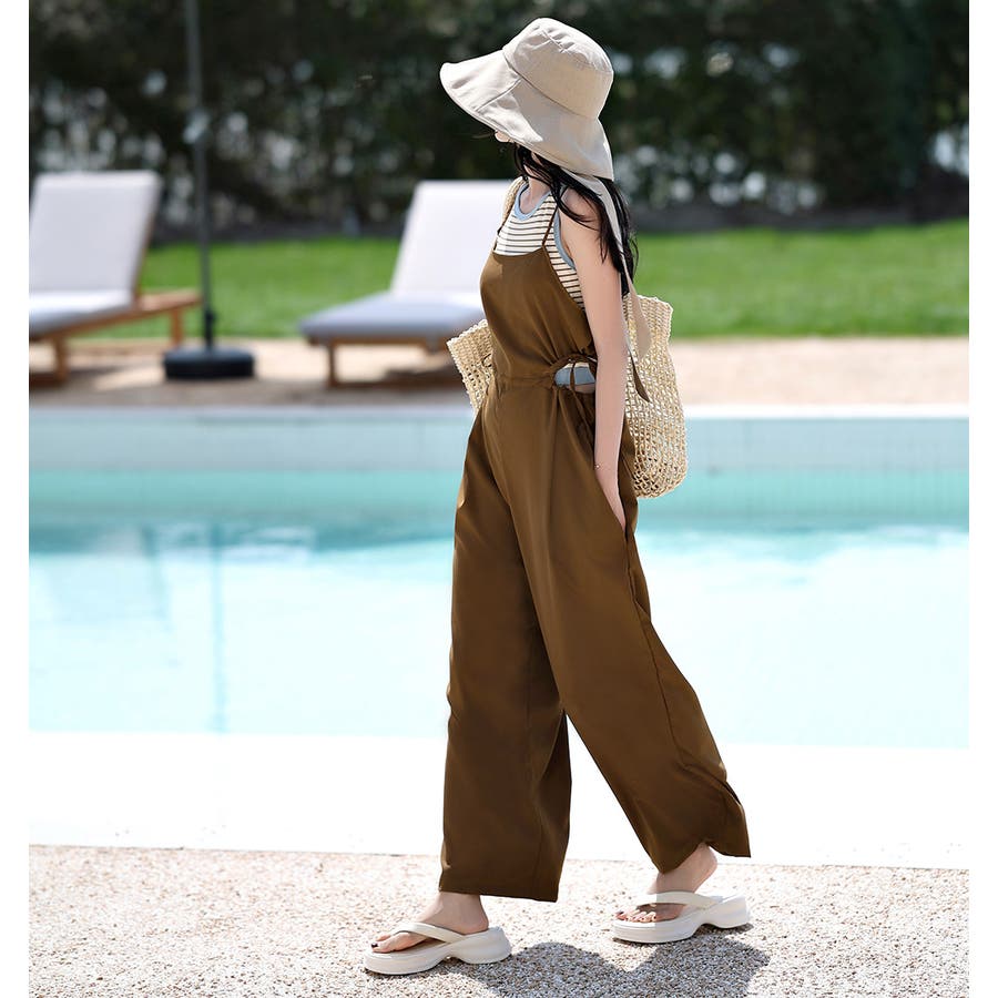 ちりめん生地のサロペはワイドシルエットですっぽりと脚を隠せる