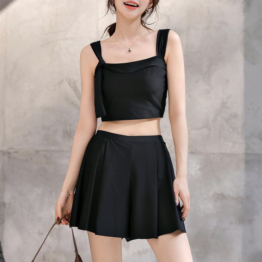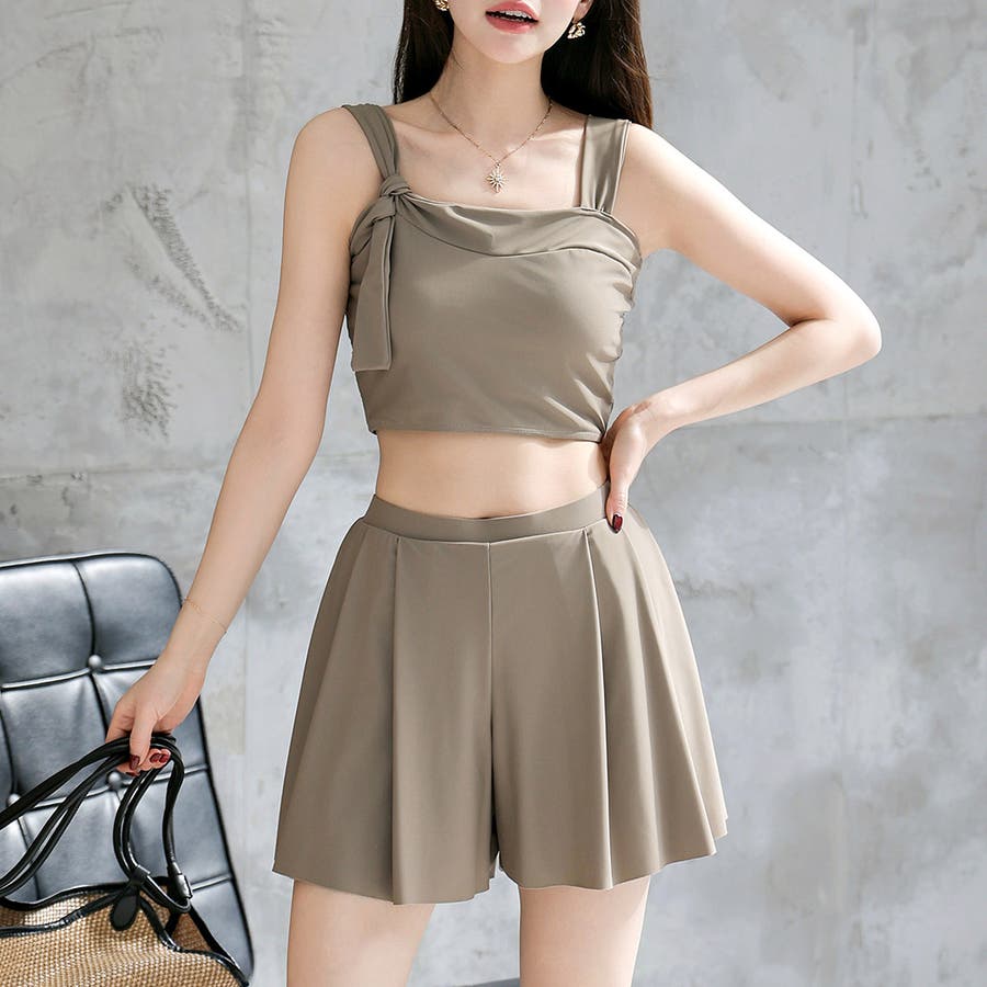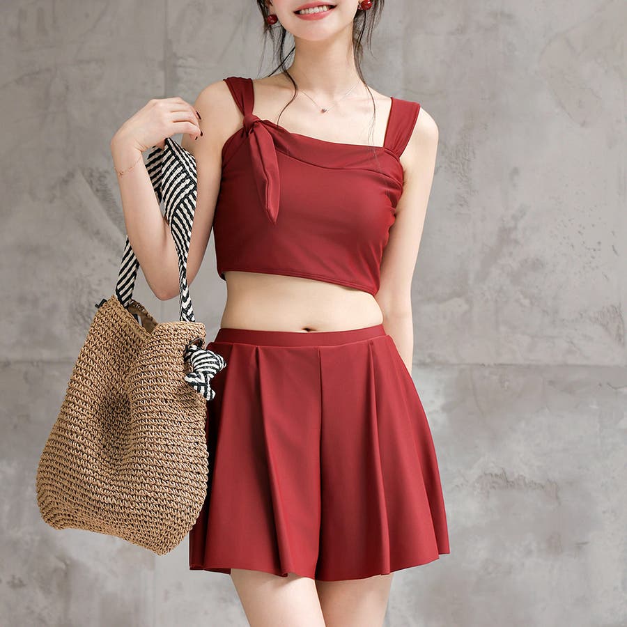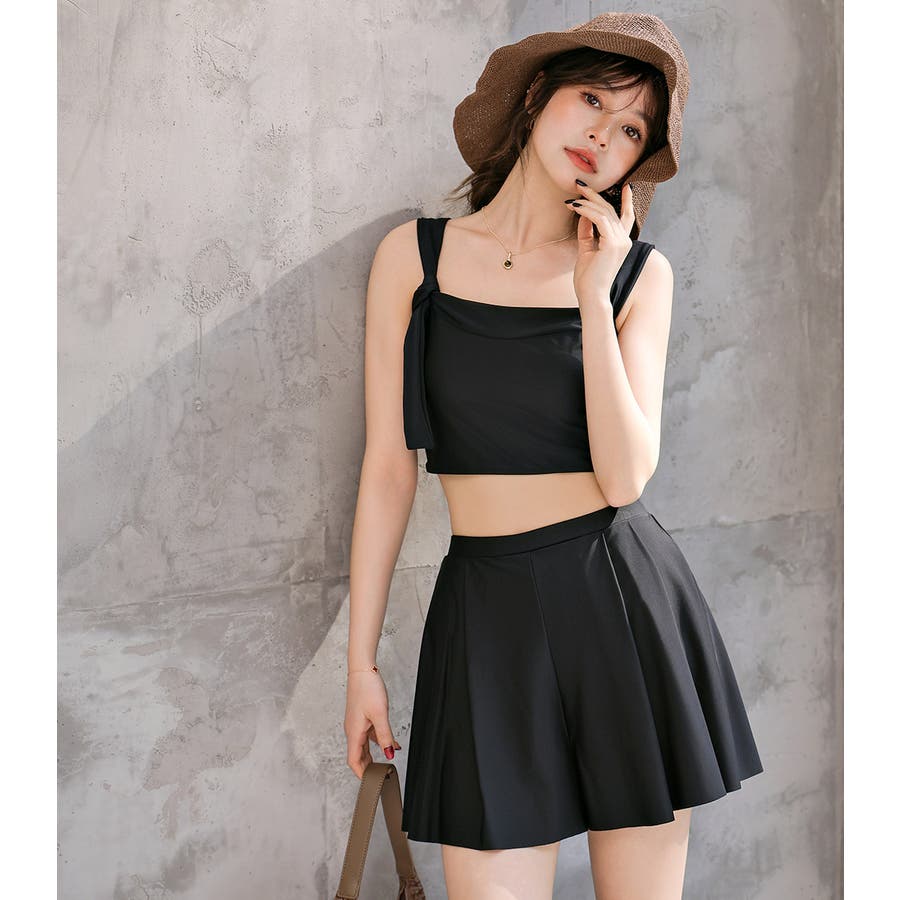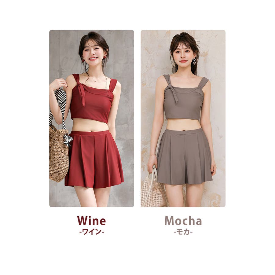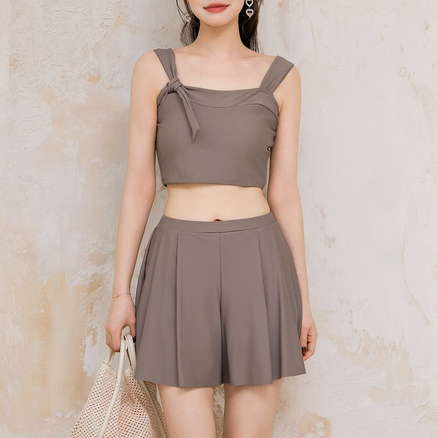 シンプルながらもアシメストラップでアレンジの利いた2点セット水着