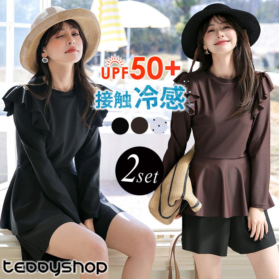 動くたびにふんわり揺れるショルダーフリルと、裾のフレアが大人フェミニンな長袖2点セット水着。