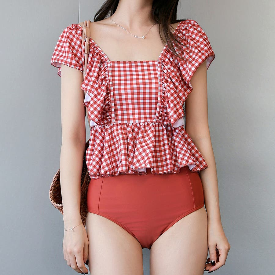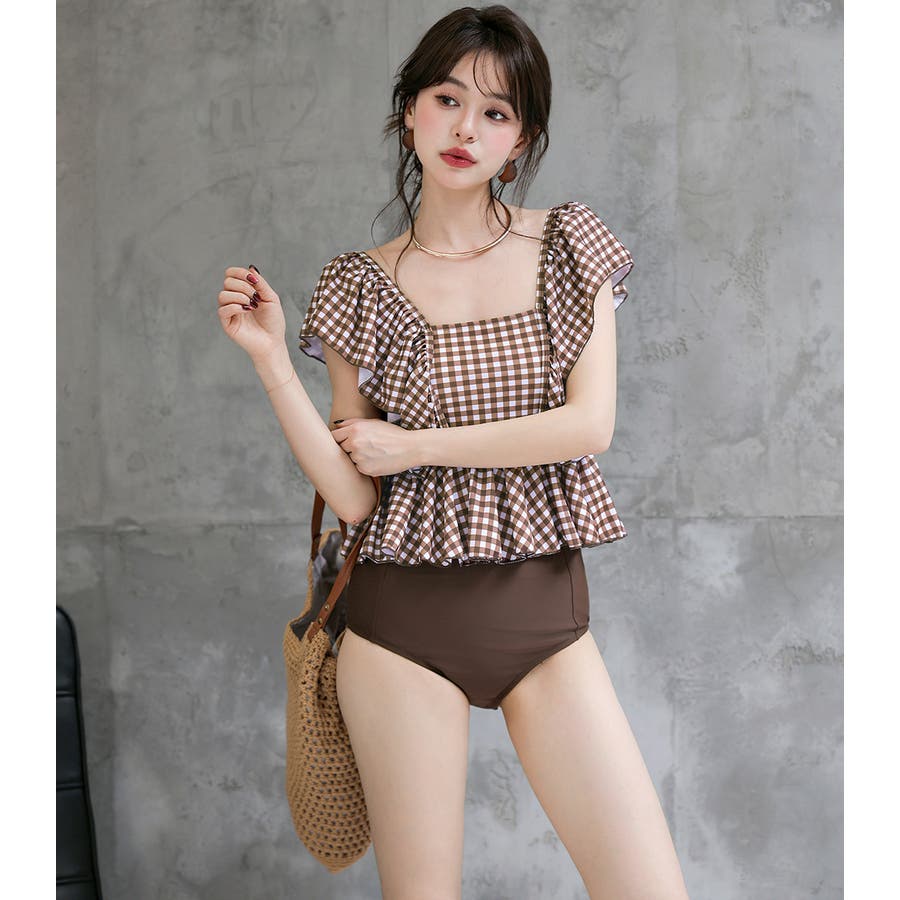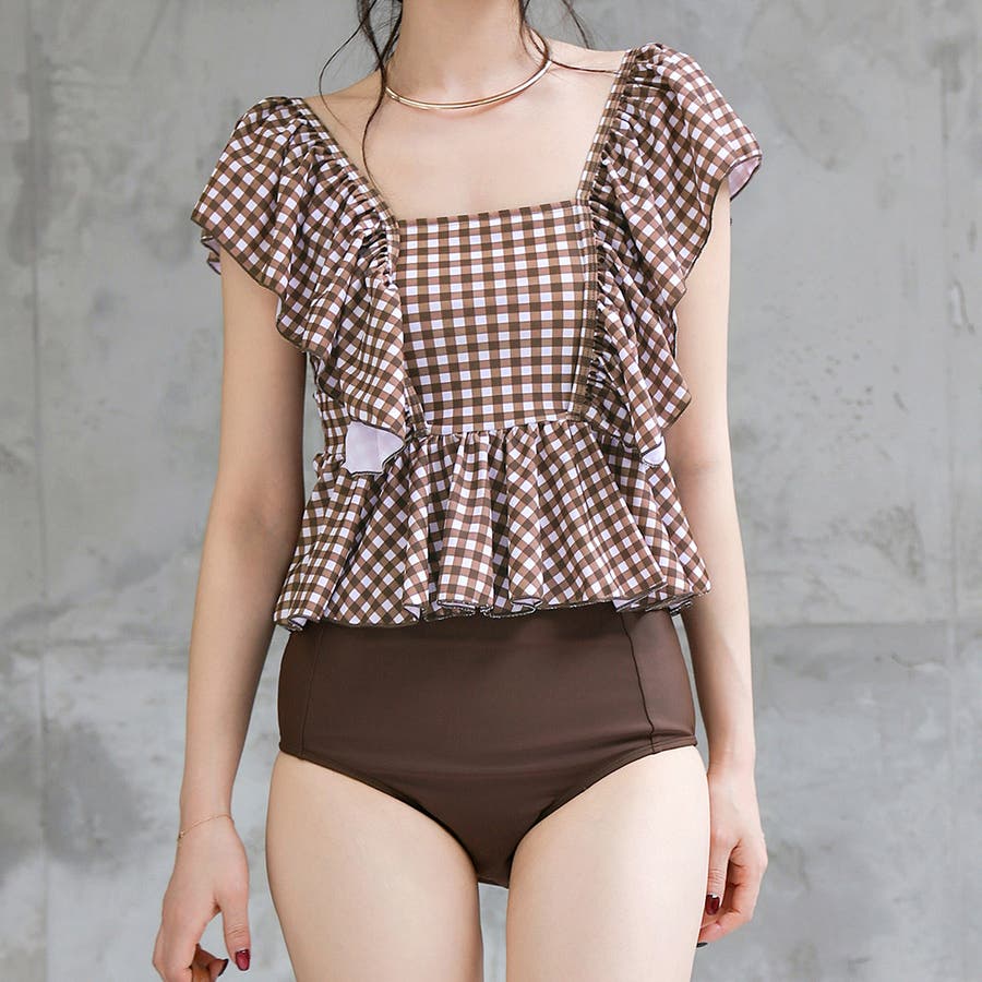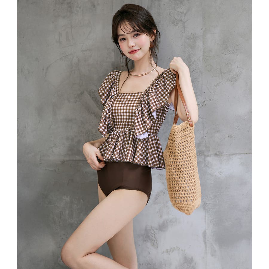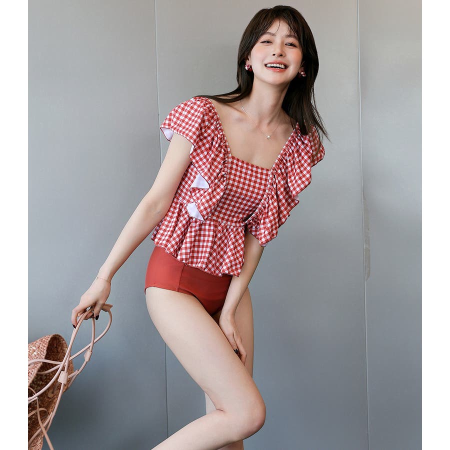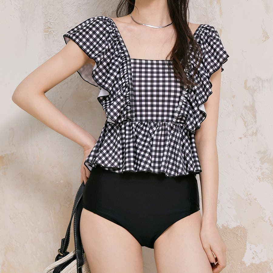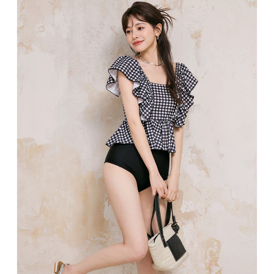 肩から胸下までのたっぷりフリルで肩回りを華奢見せ。