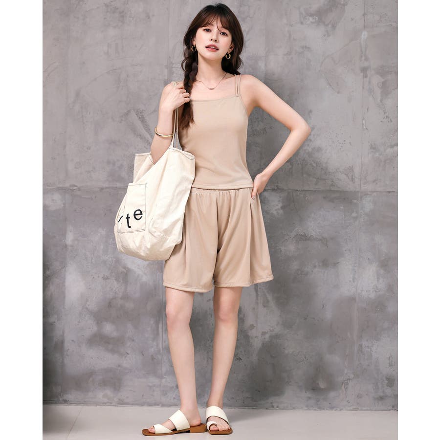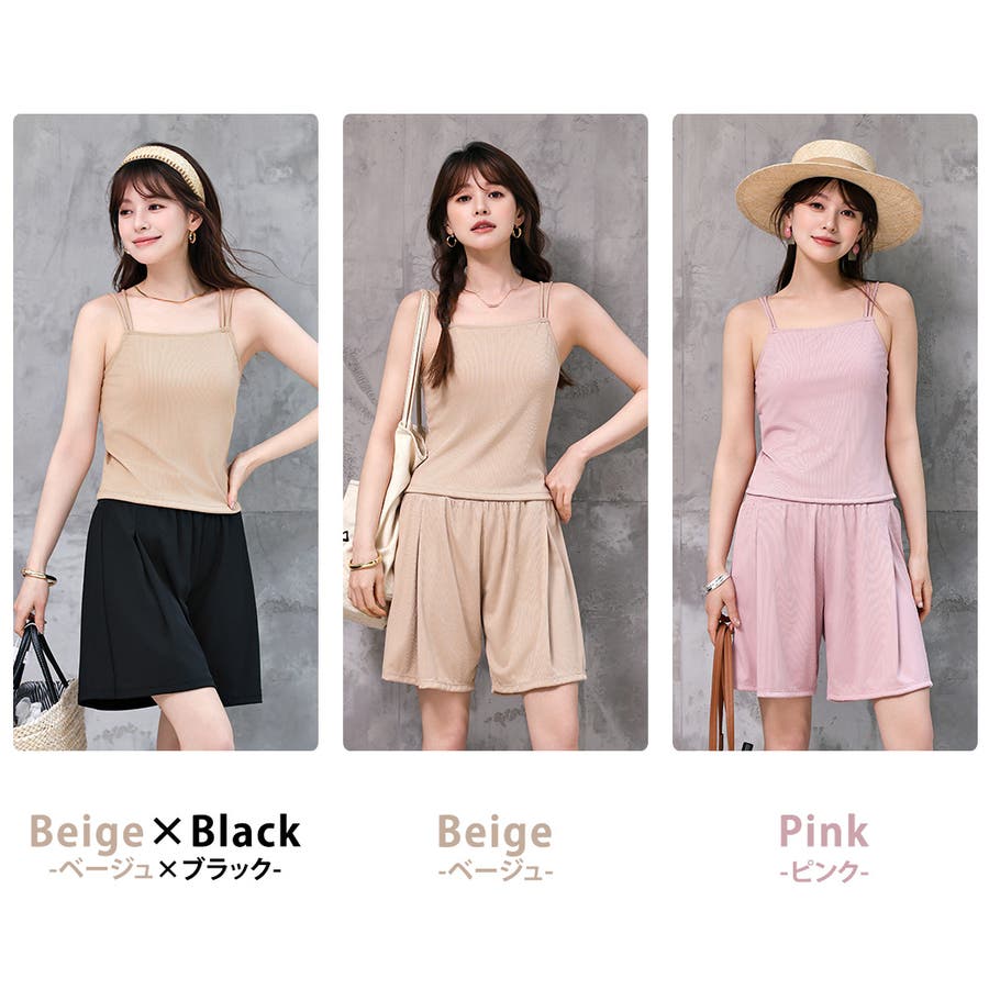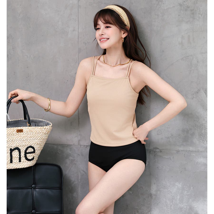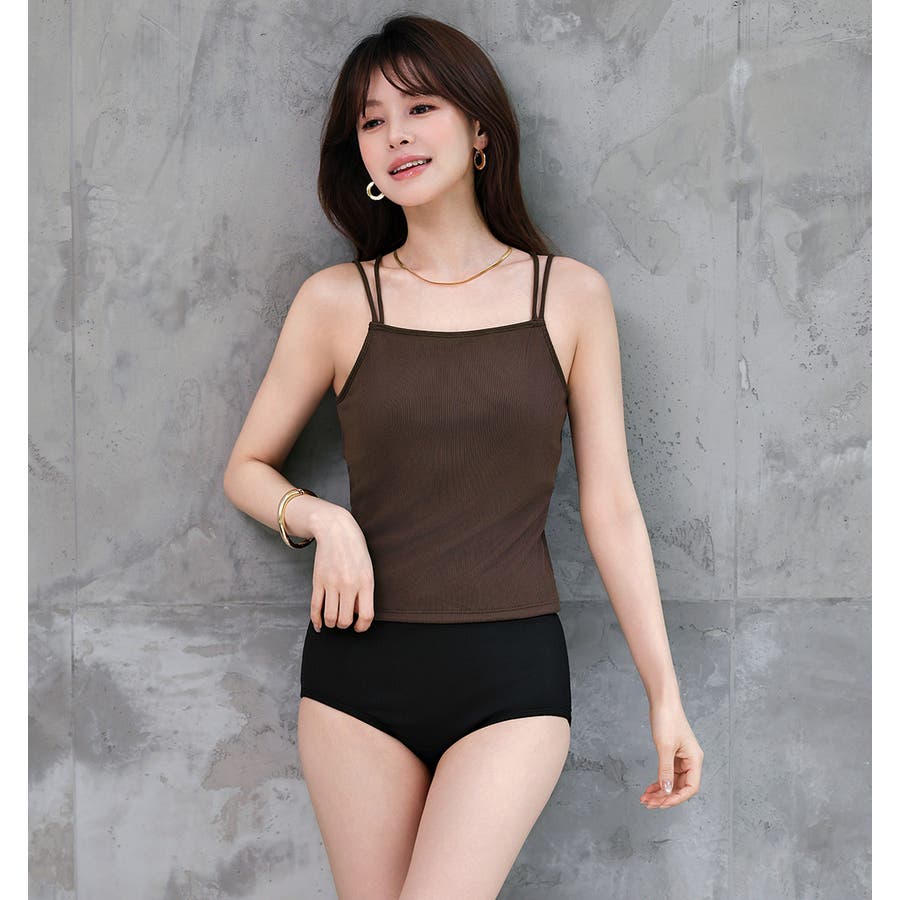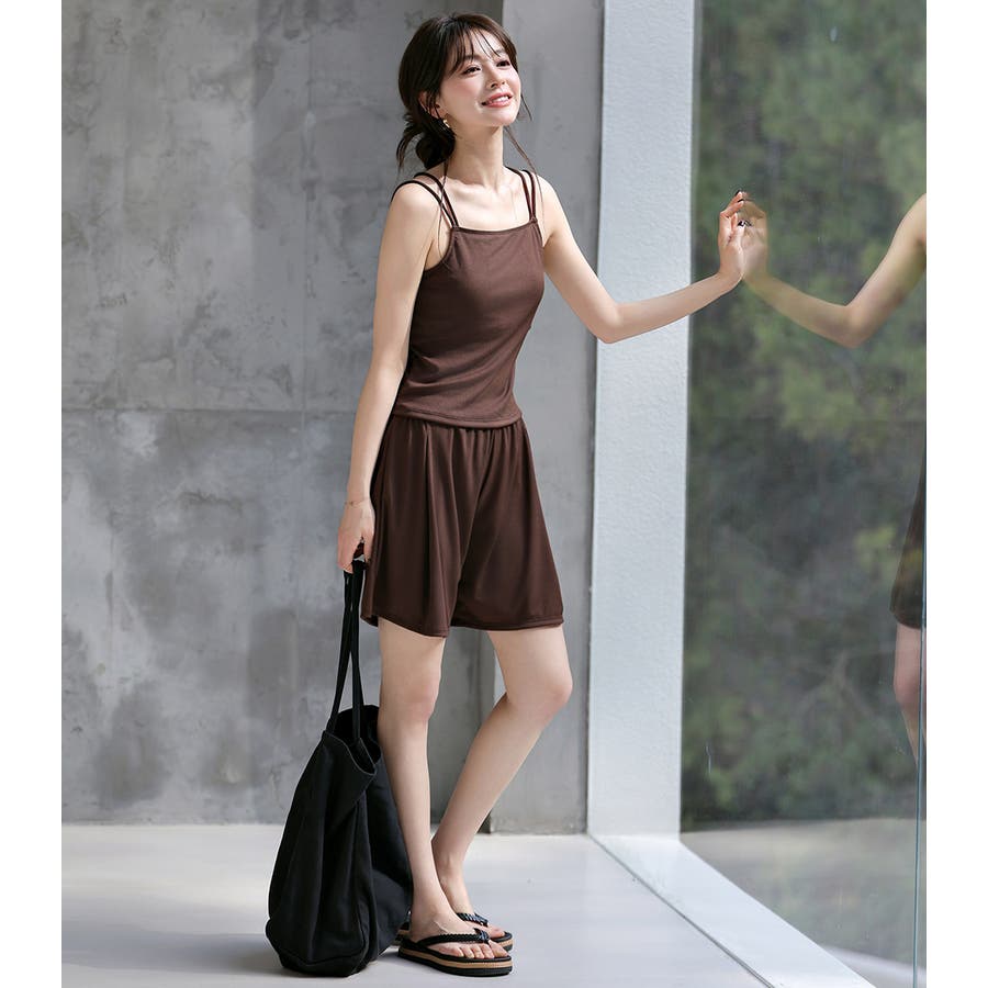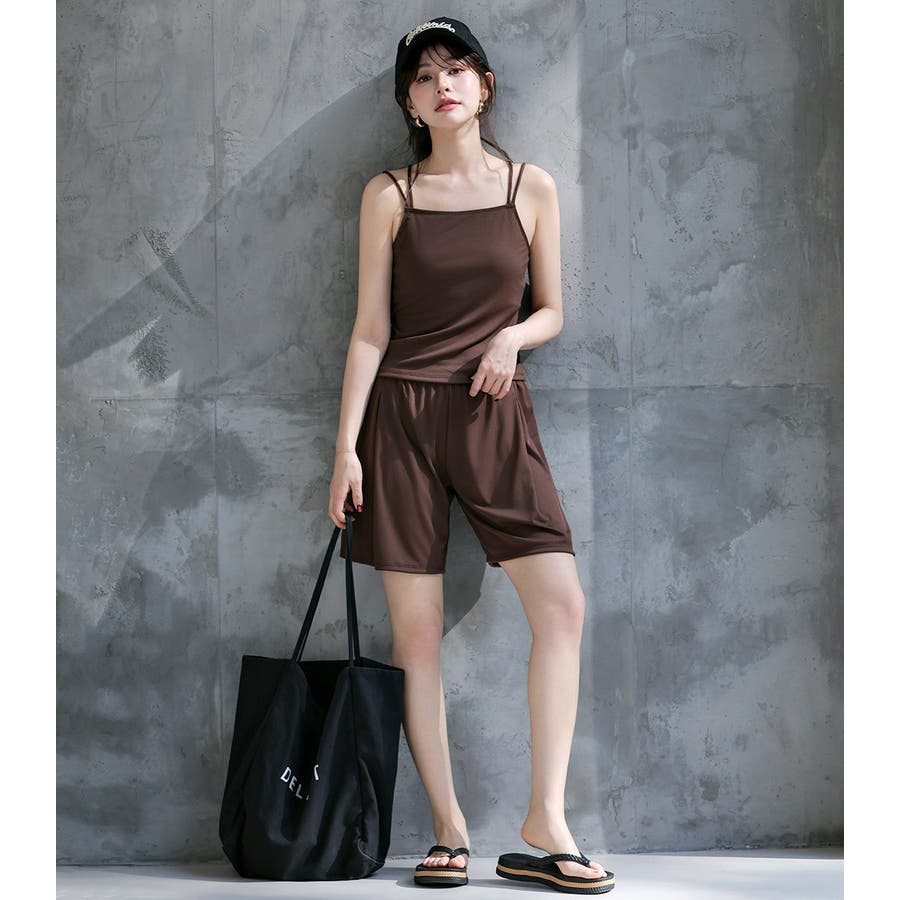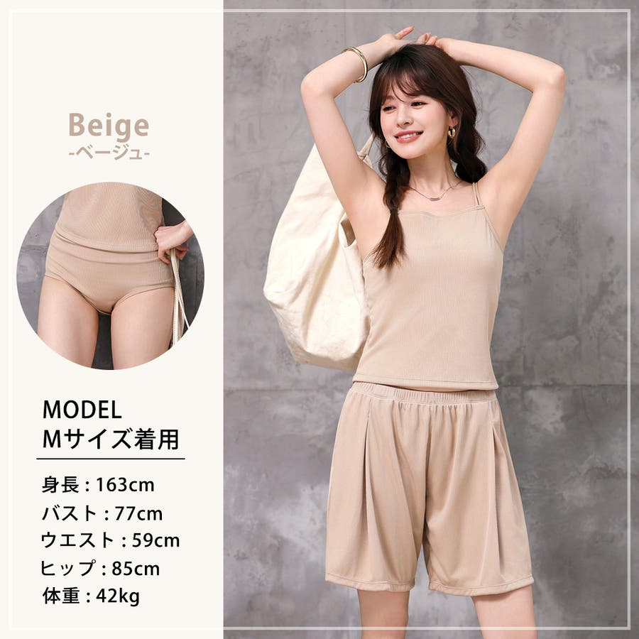 ショートパンツを穿いた露出控えめなコーデと、ショーツのみのキャミキニスタイルを楽しめます。