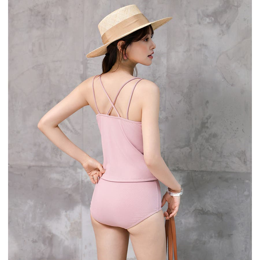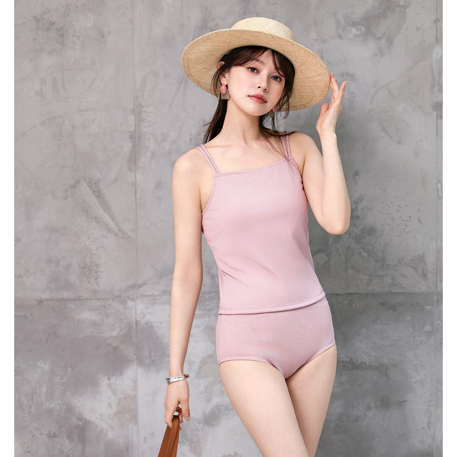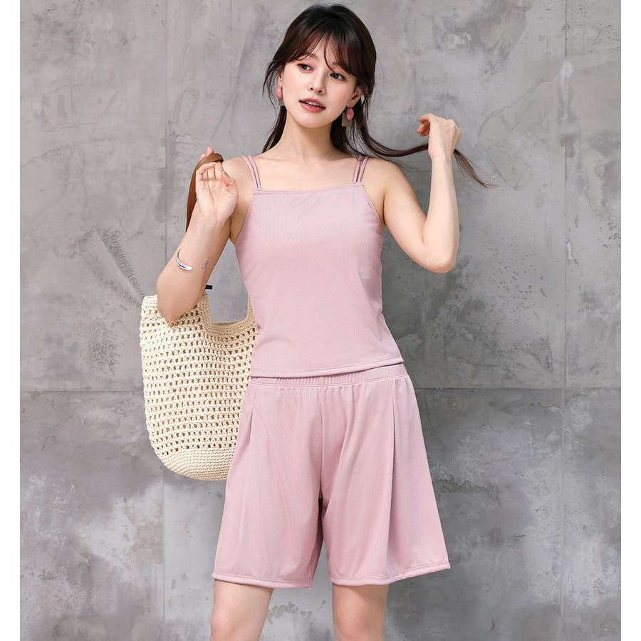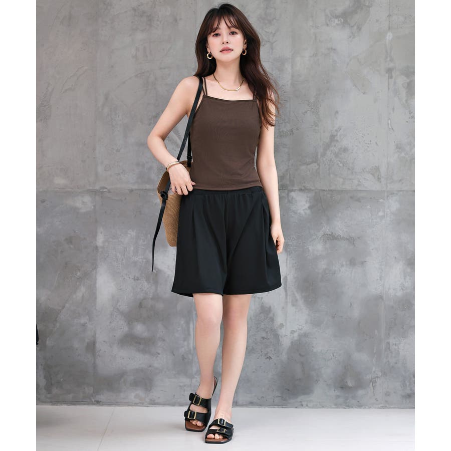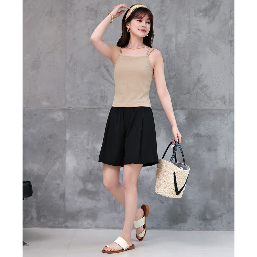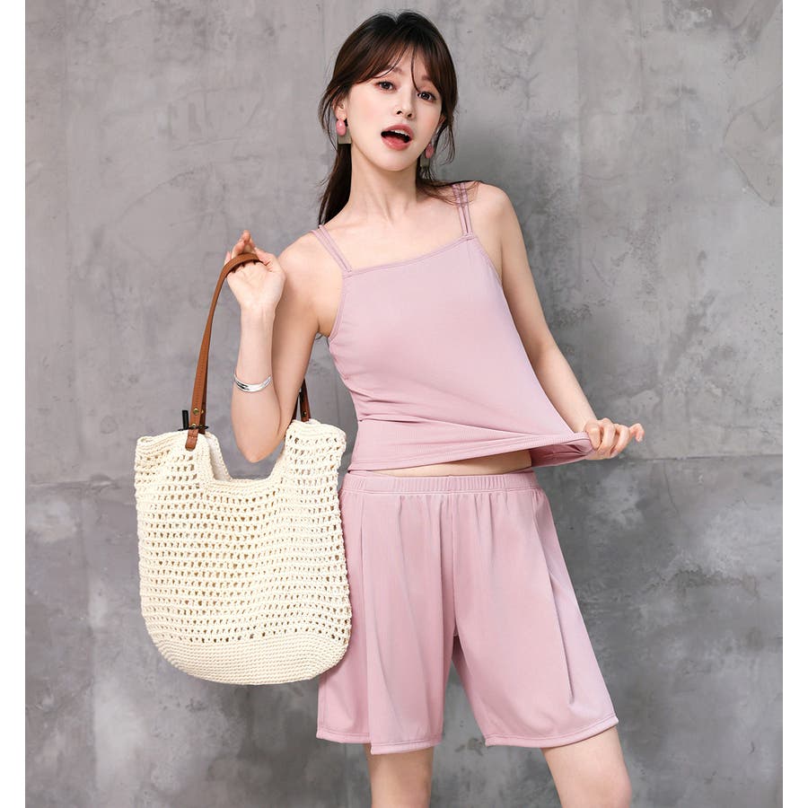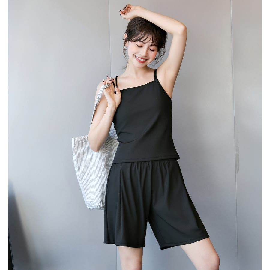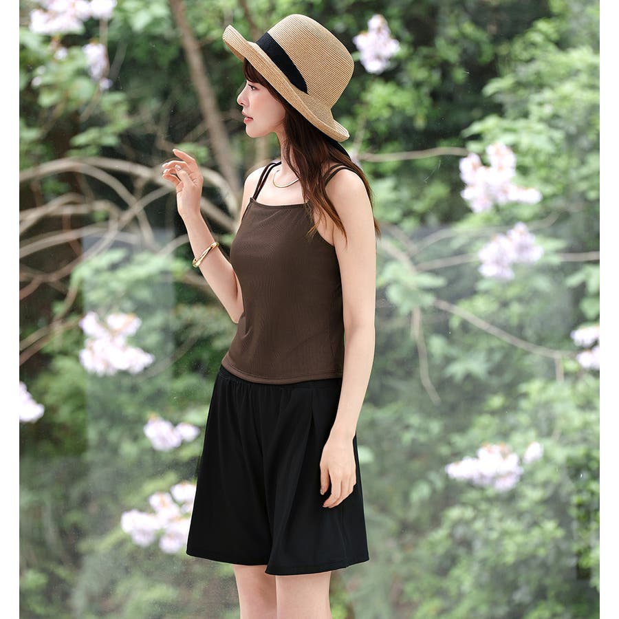 ショートパンツを穿いた露出控えめなコーデと、ショーツのみのキャミキニスタイルを楽しめます。
