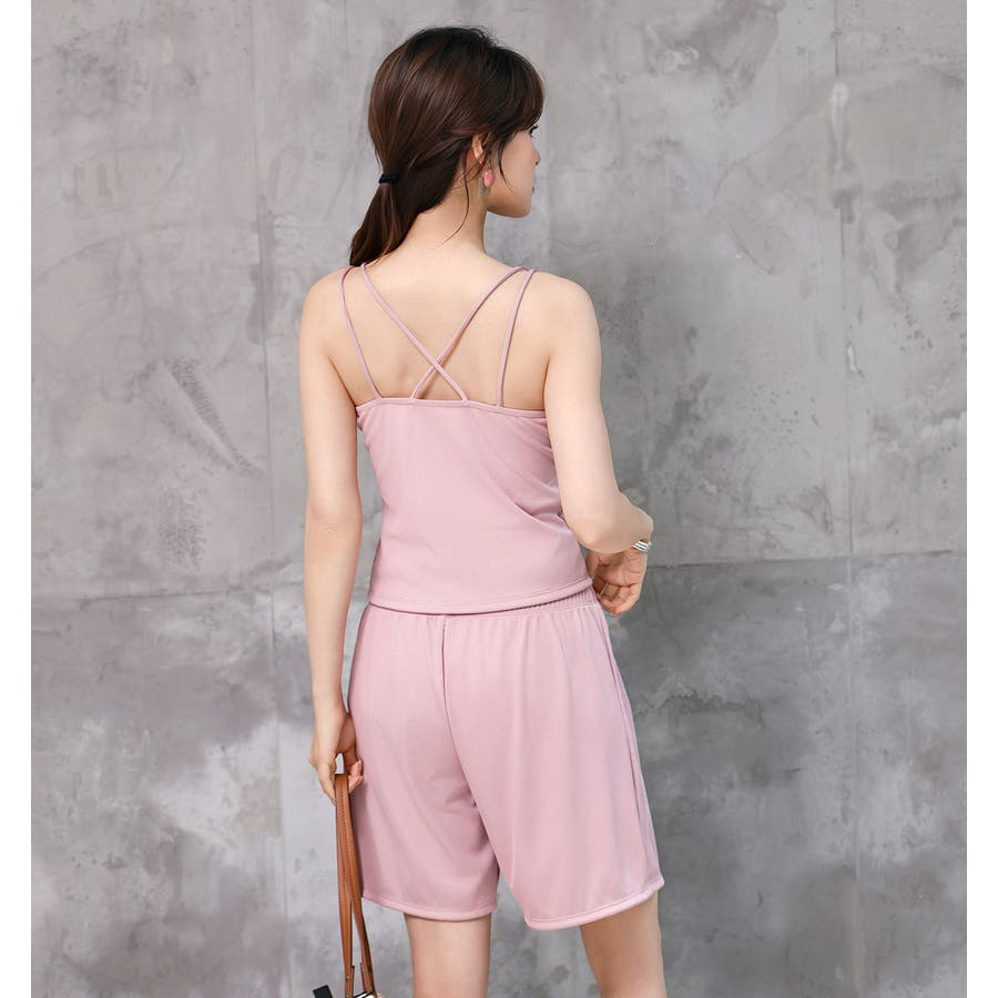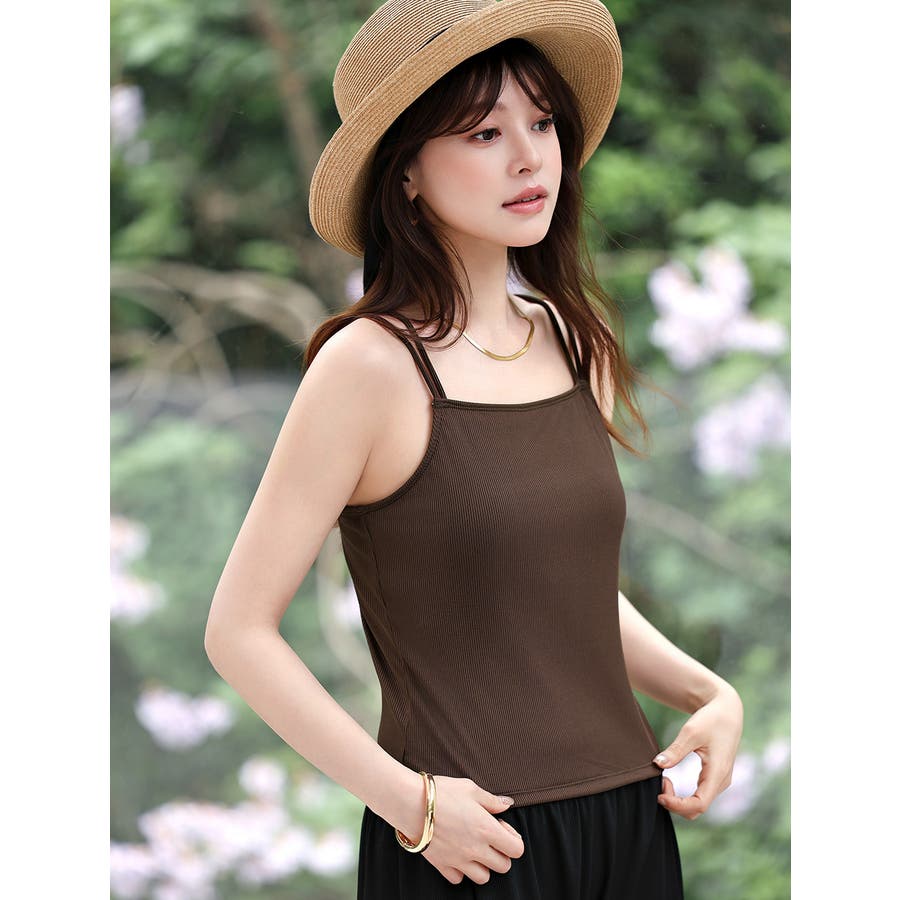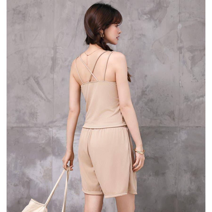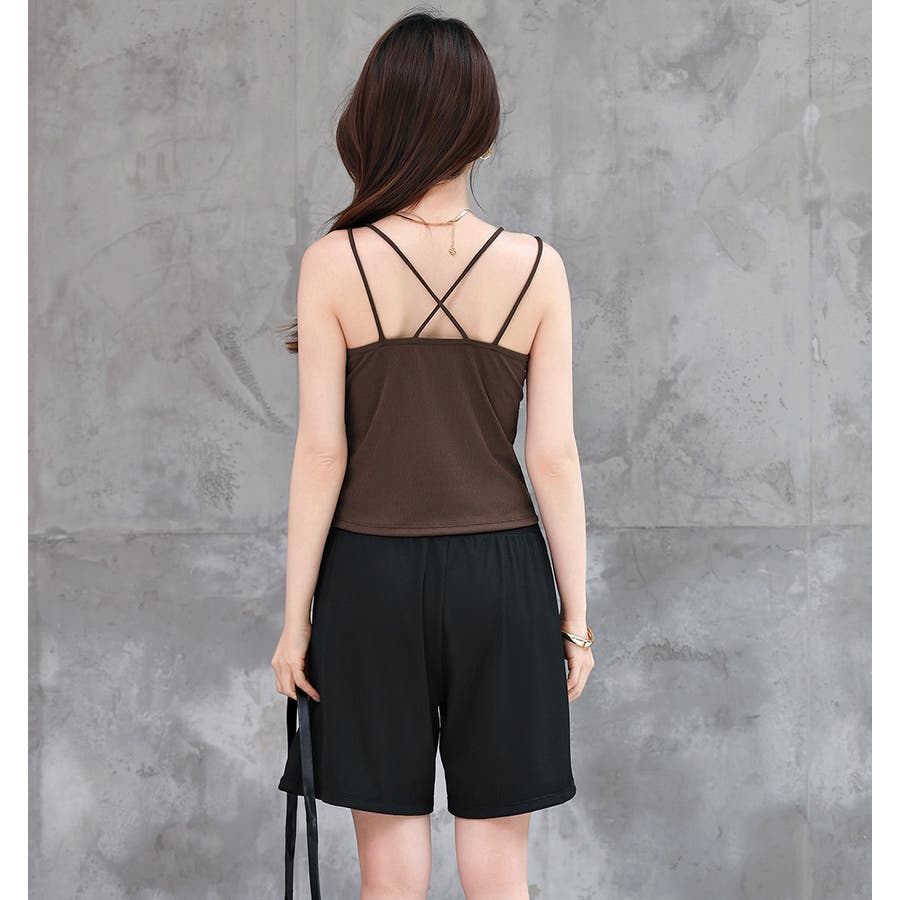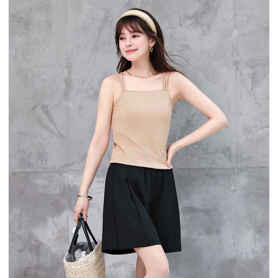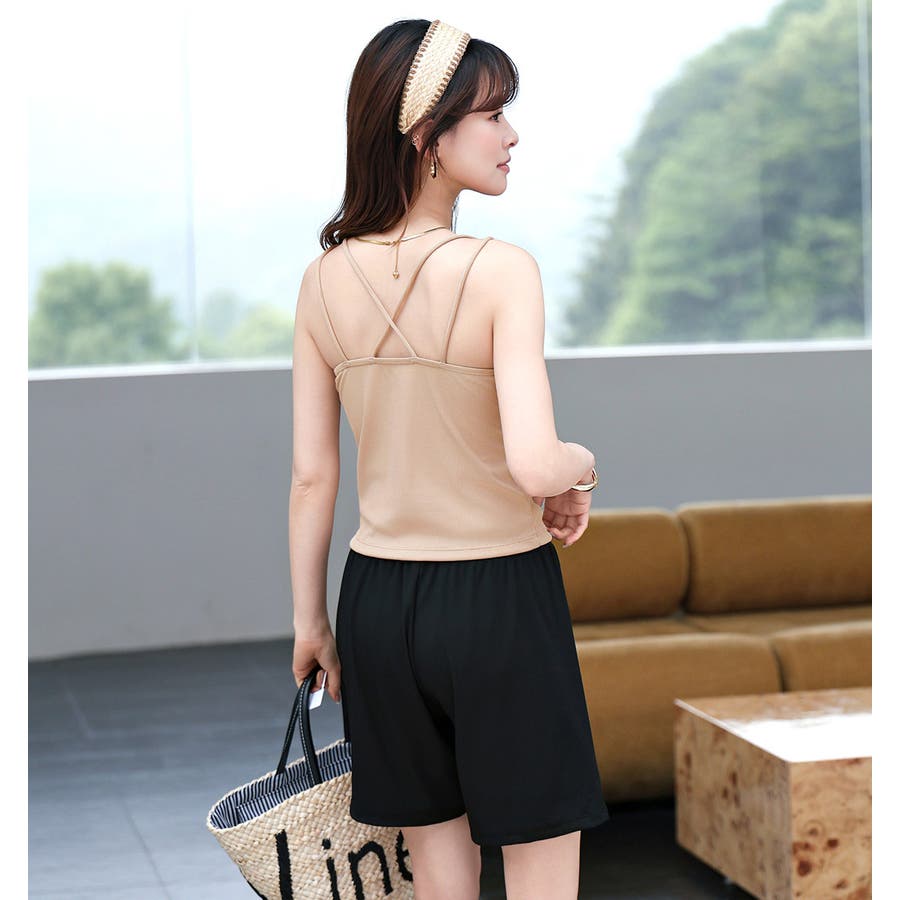 華奢なストラップが女性っぽいキャミソール風トップス。