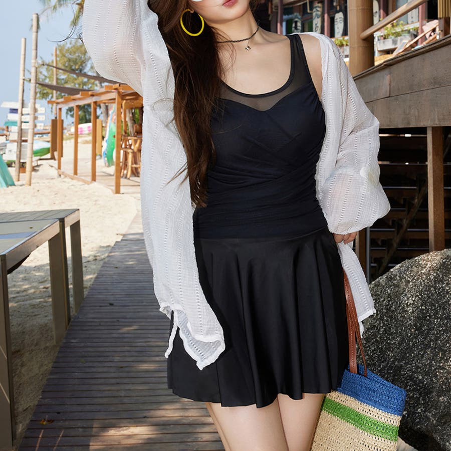 シンプルなシアーカーディガンとワンピ水着の2点セット。