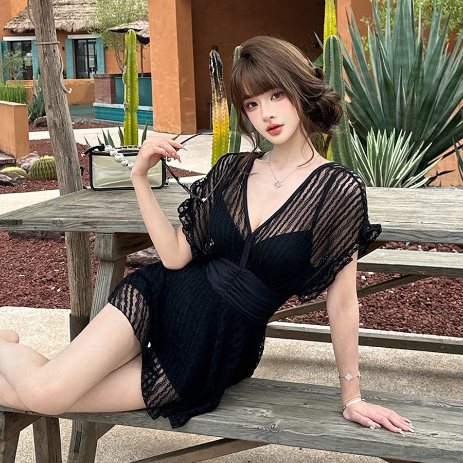 透け感あるレースメッシュ生地×ツルっとした肌触りのプレーン水着生地