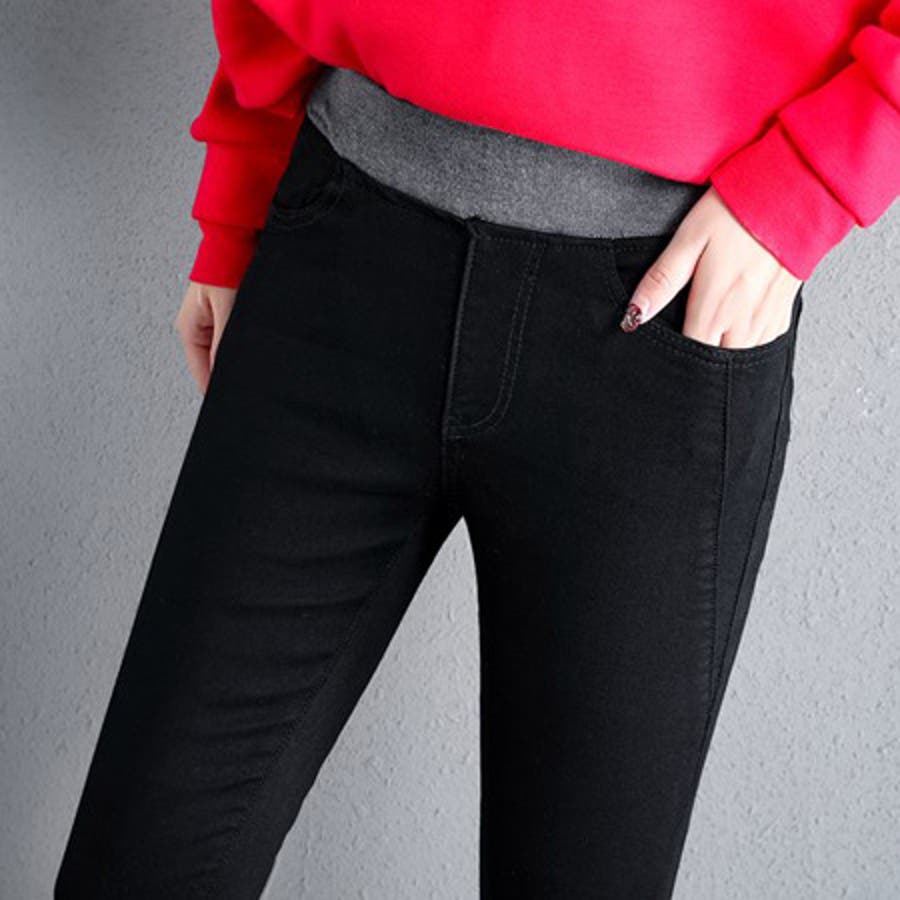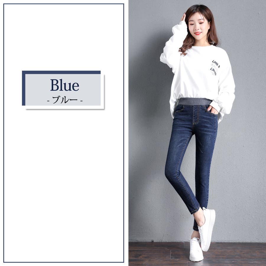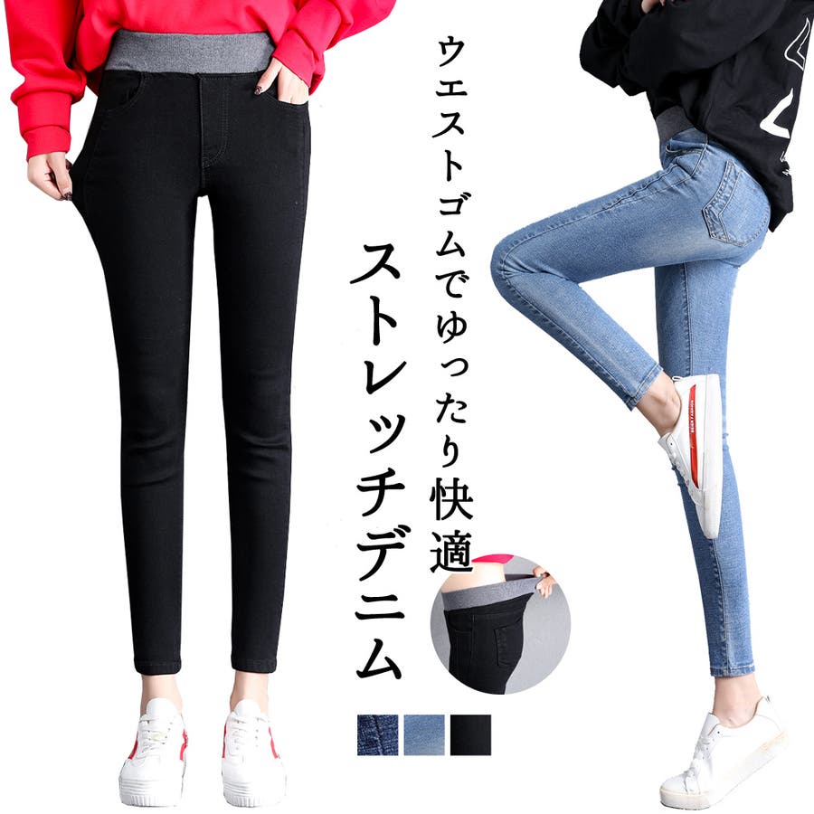 定番のスキニーパンツデザインでウエストはゆったりゴム仕様