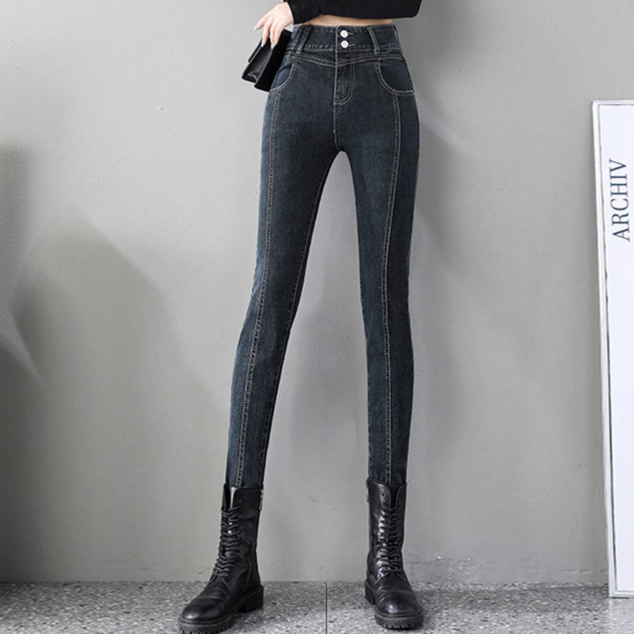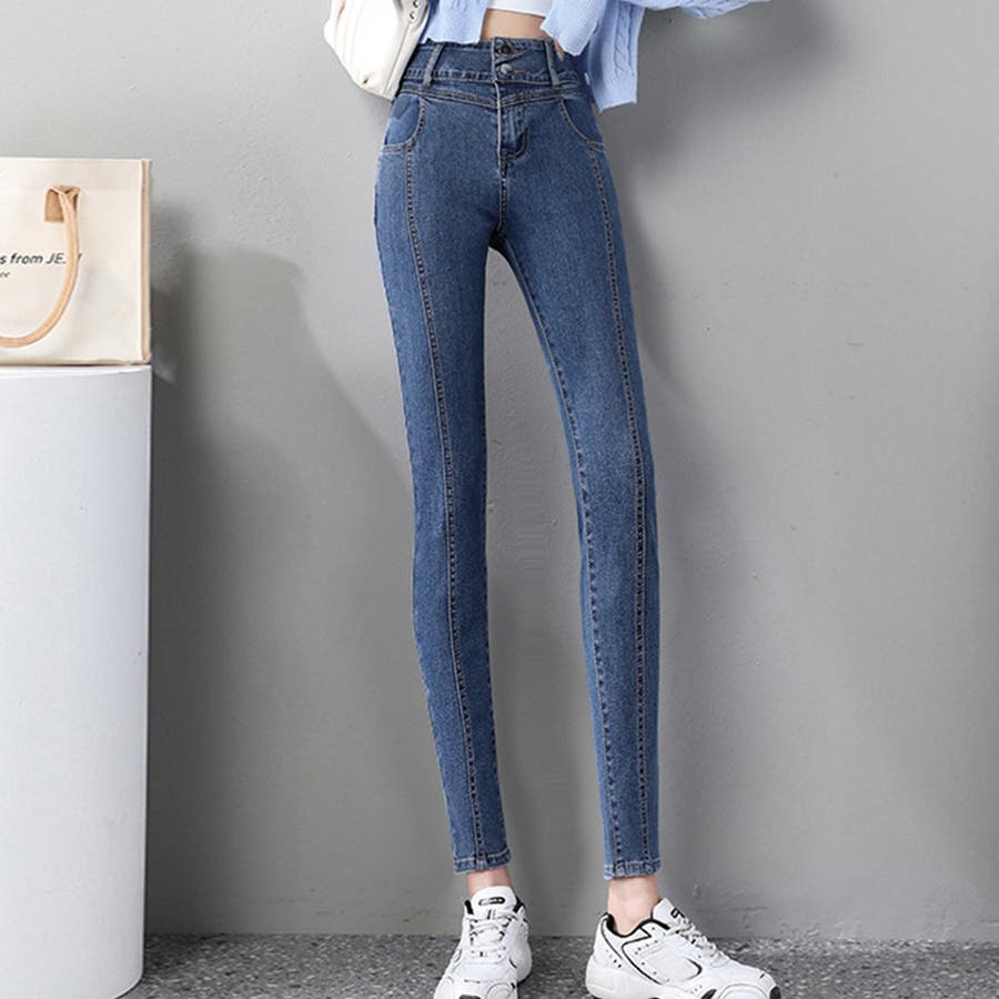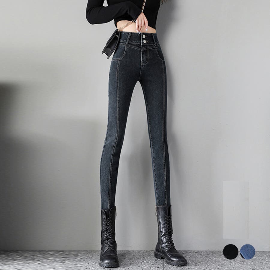 ハイウエストでウエストデザインからほっそり魅せ叶うデニムスキニー。