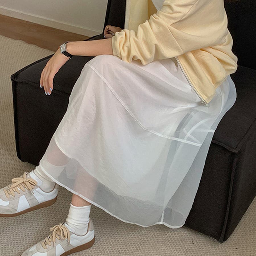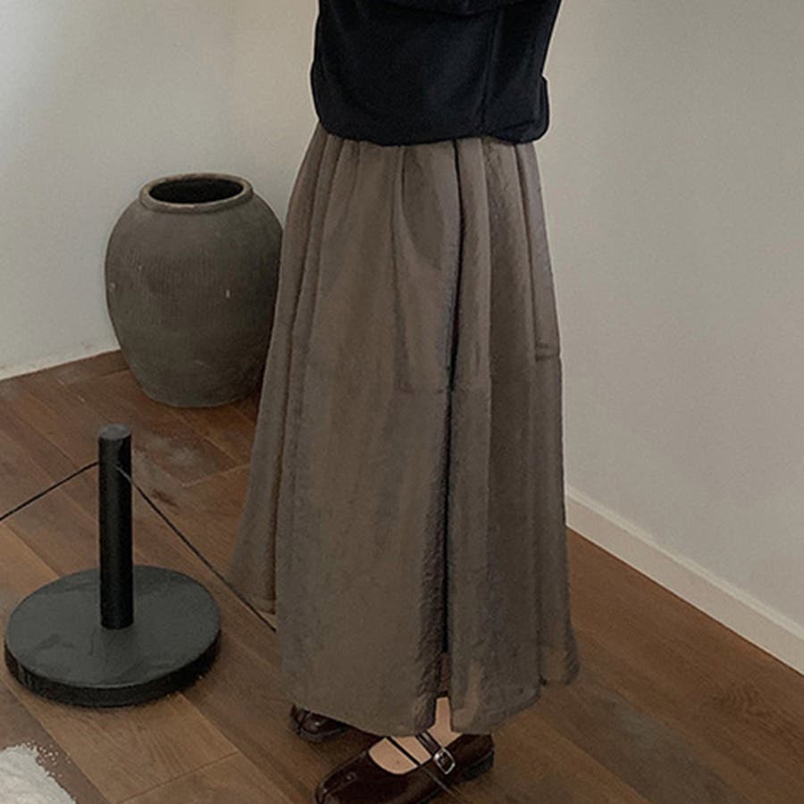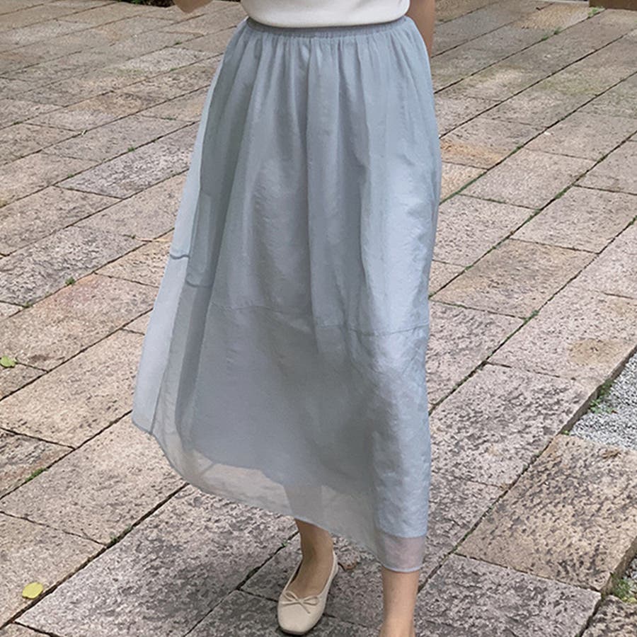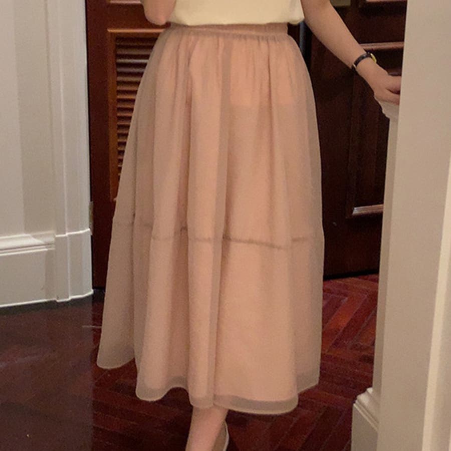 表地のオーガンジー生地にほんのり光沢があるシンプルなスカート。