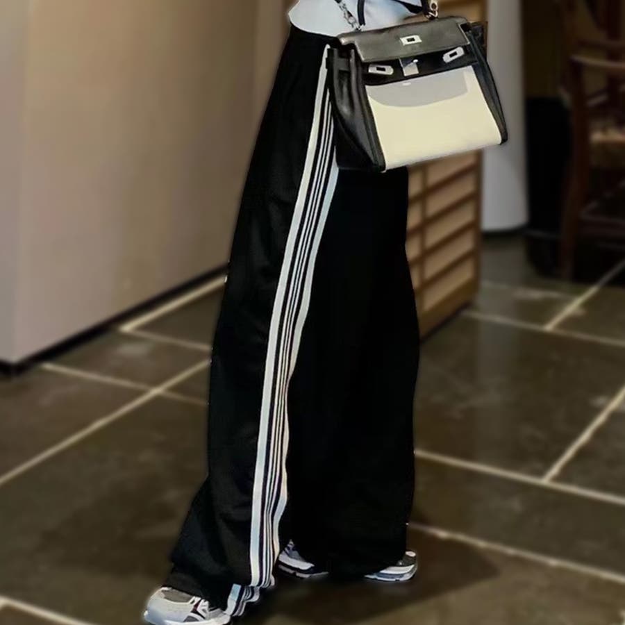 ジャージ風のライン入りトラックパンツ。