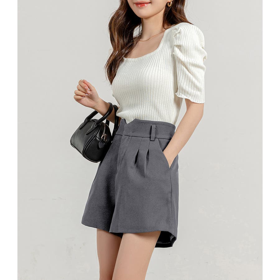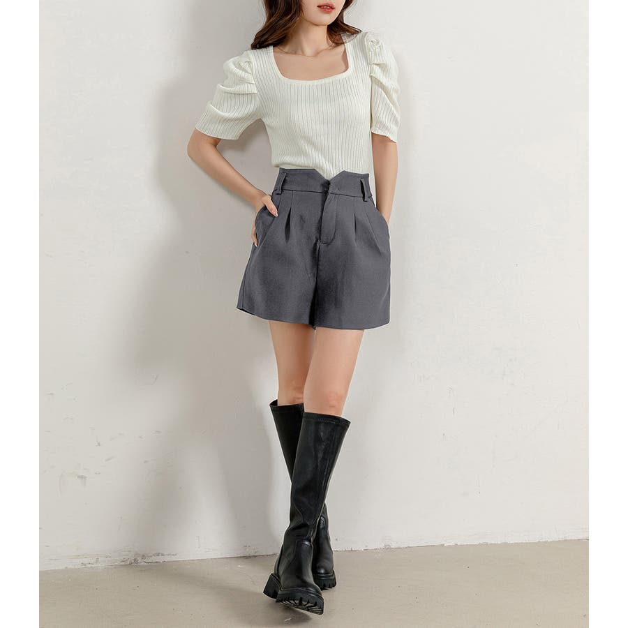 トレンドのミニボトムをきれいめにフロントタックショートパンツ