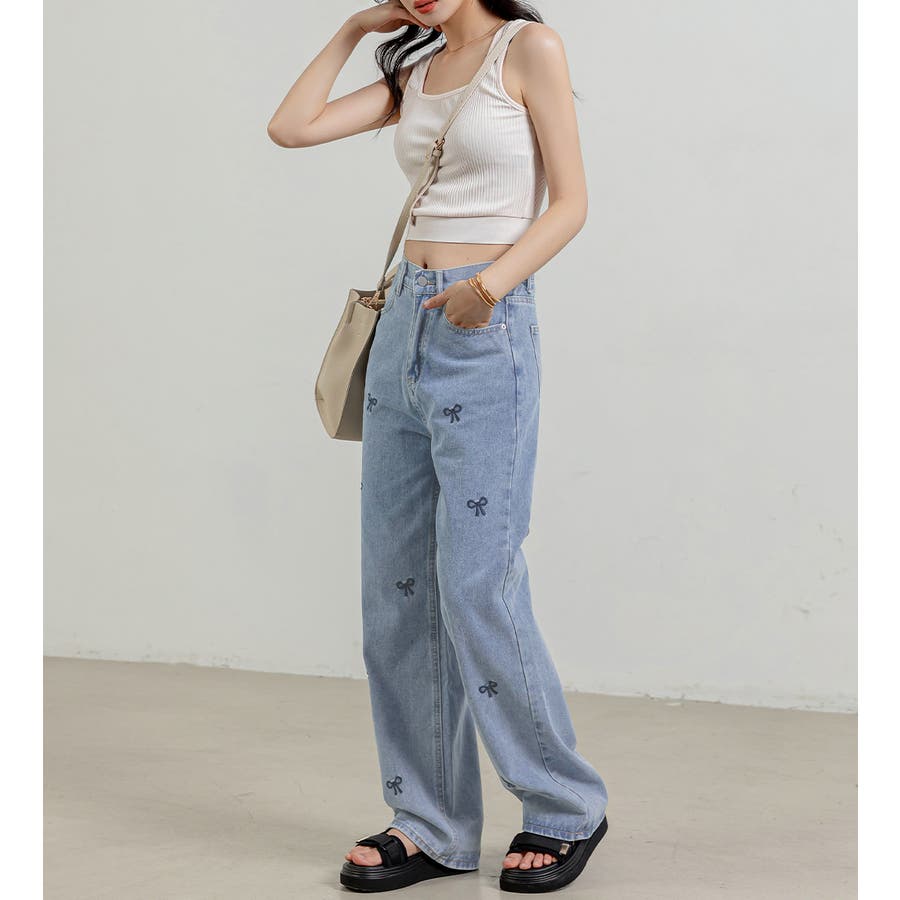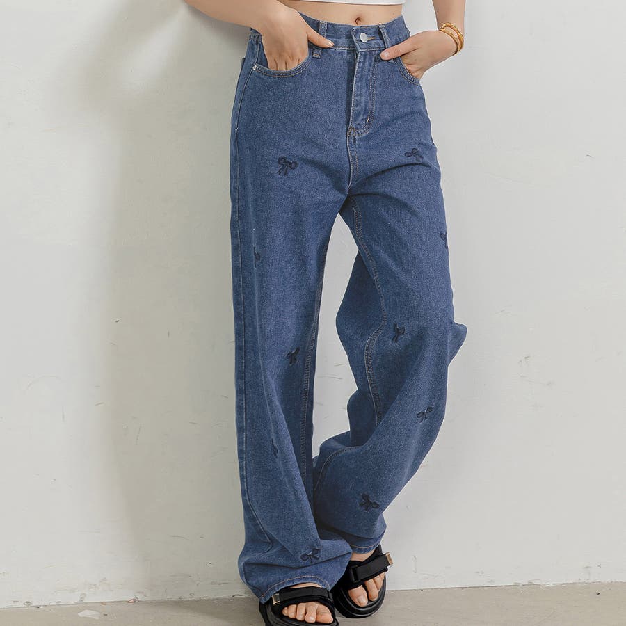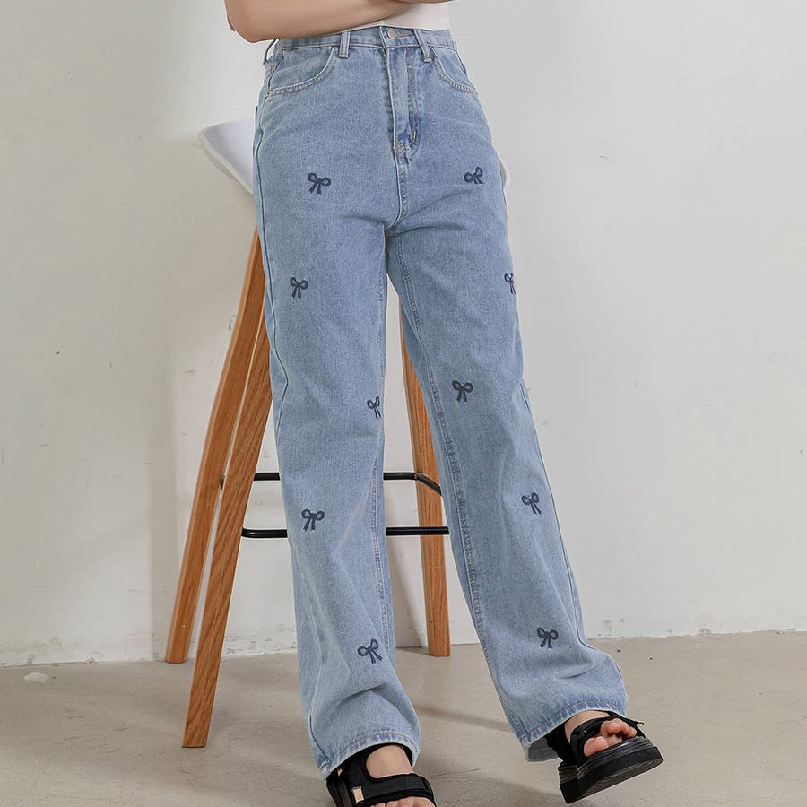 「トレンド感あるリボン刺繍入り」ガーリーデニム
