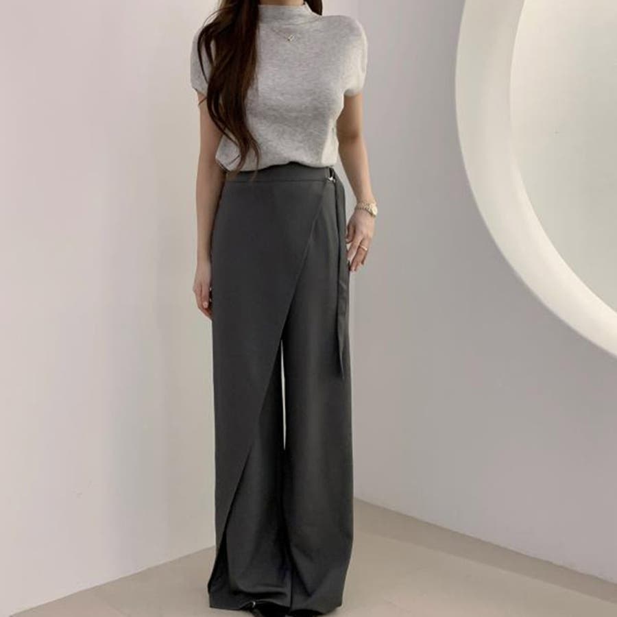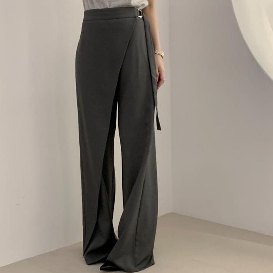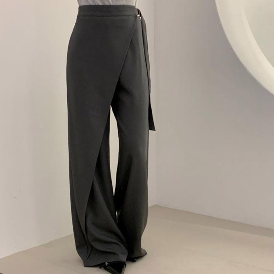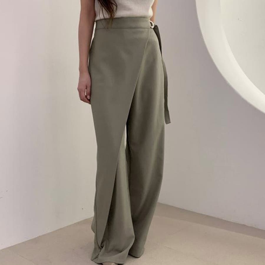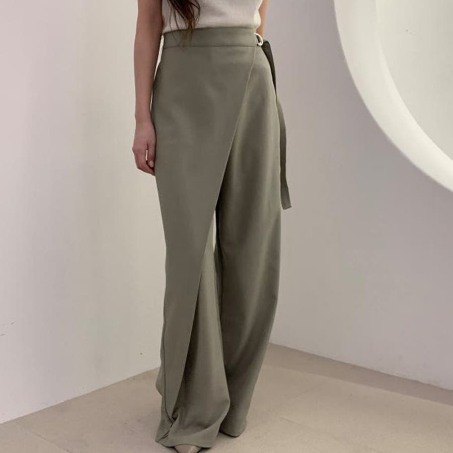 女性らしいシルエットを演出してくれるスカート風のラップデザイン×ストレートワイドパンツ。