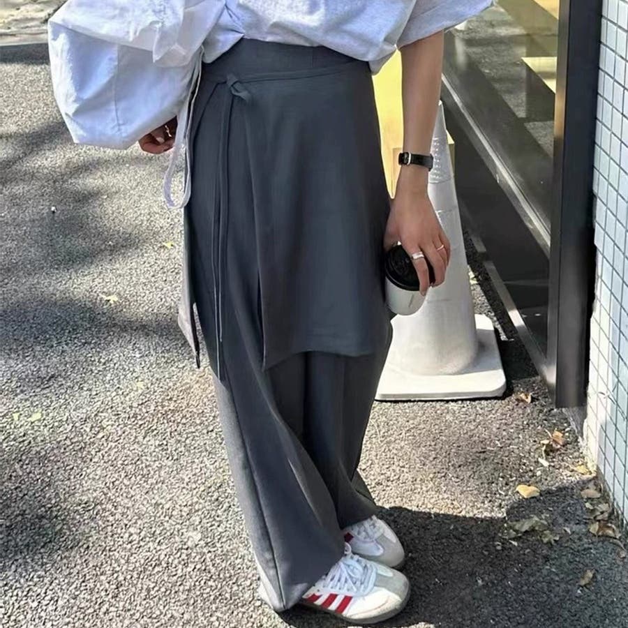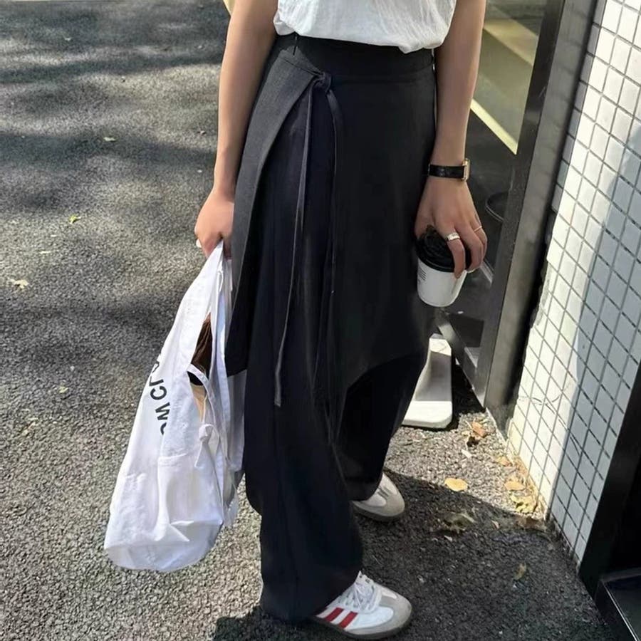 韓国っぽコーデ・Y2Kコーデにマッチしたトレンド感のあるラップスカート付きスラックスパンツ。