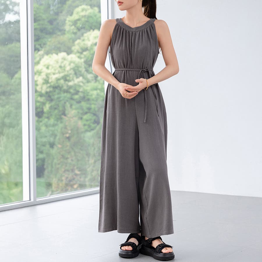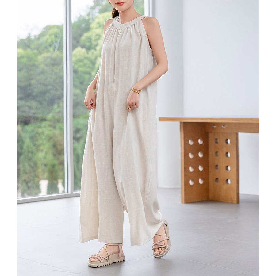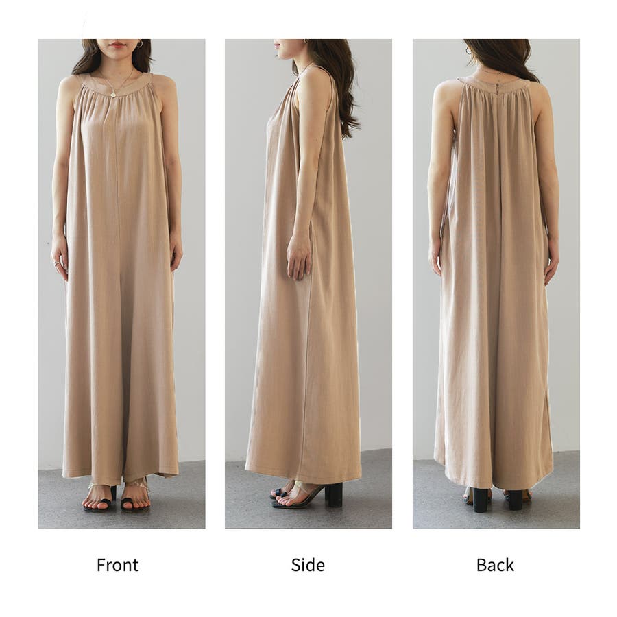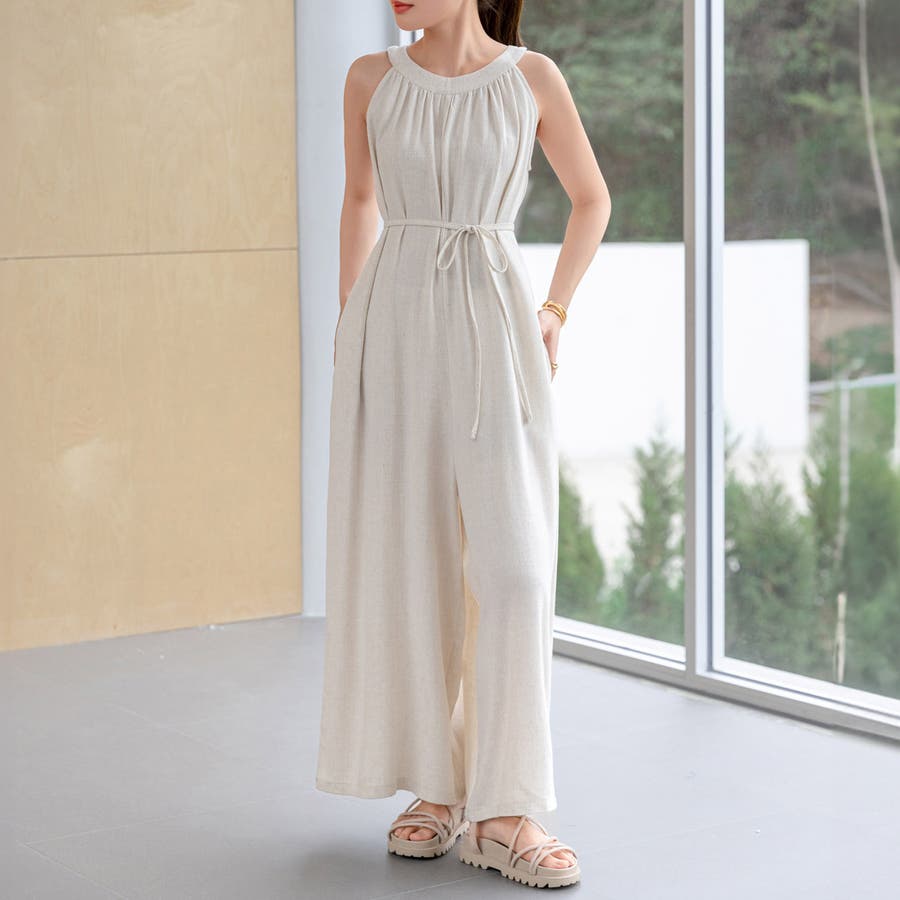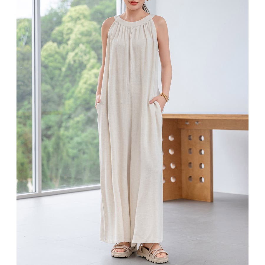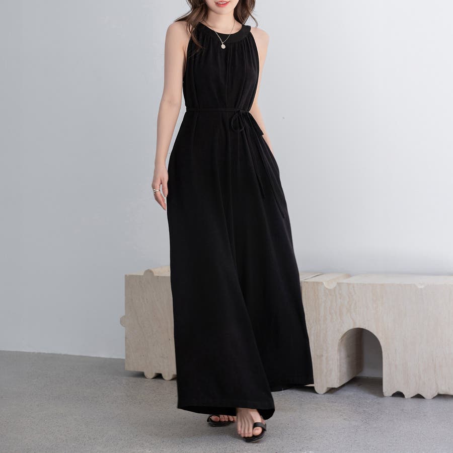 軽やかな着心地と美しいシルエットが魅力のホルターネック風サロペット。