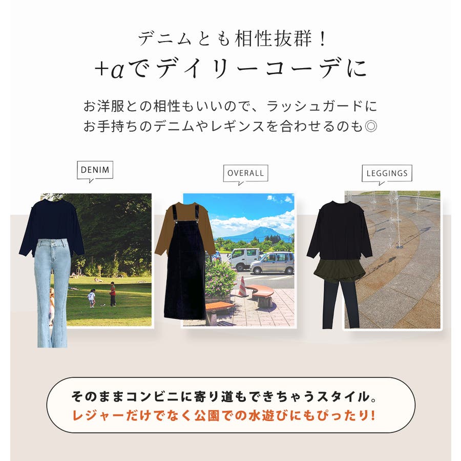 お洋服との相性もいいので、ラッシュガードにお手持ちのデニムや合わせるのも◎