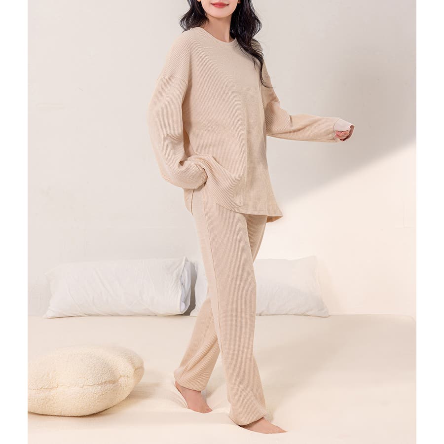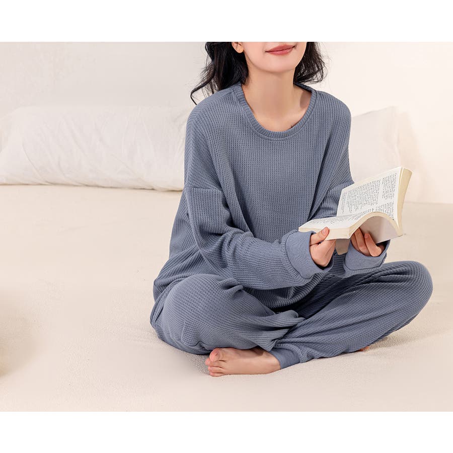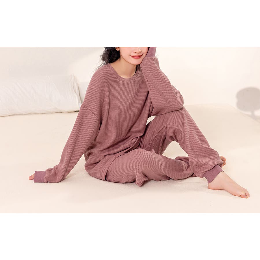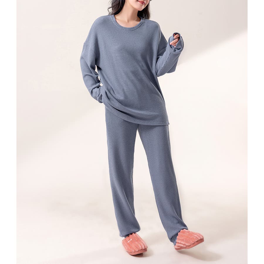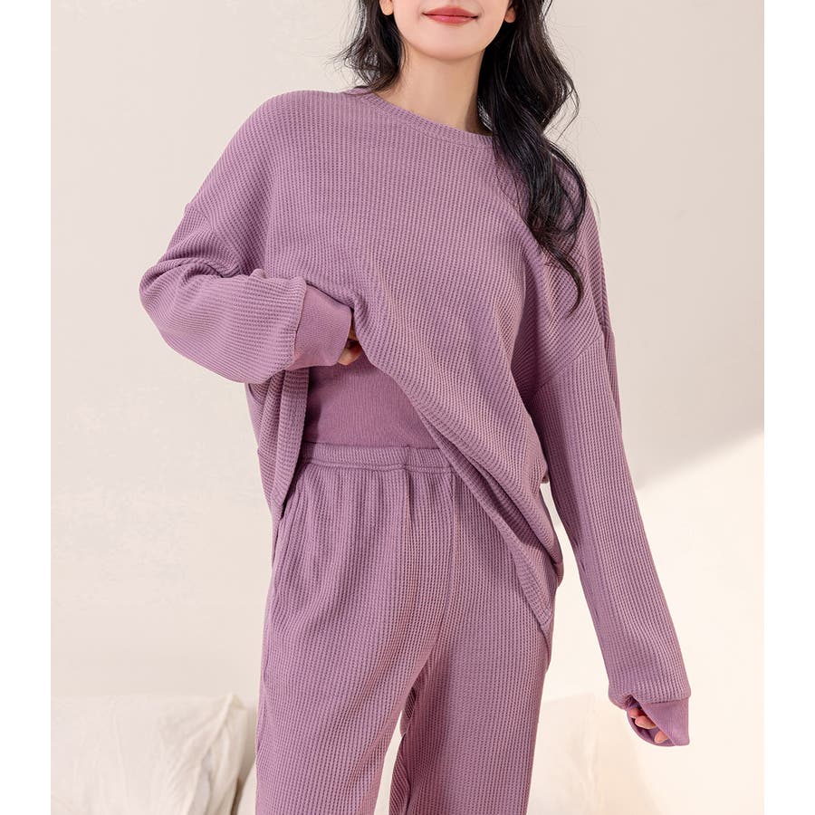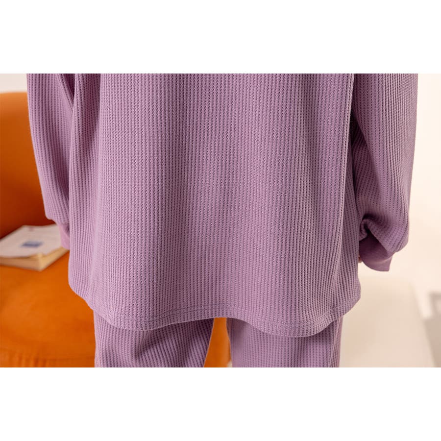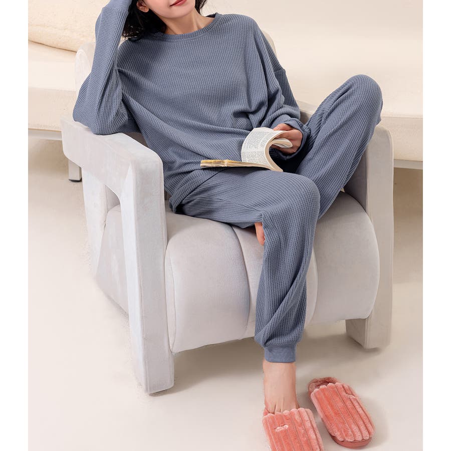 上下セットアップのワッフル生地ルームウェア。
