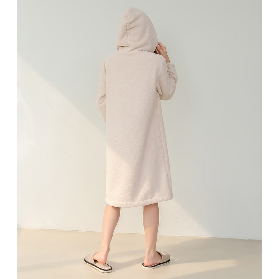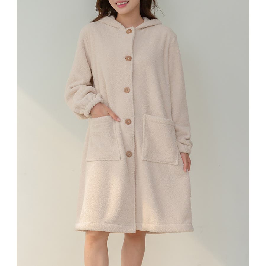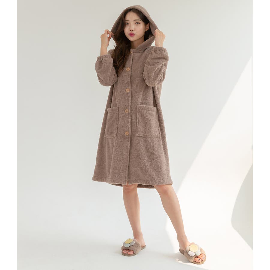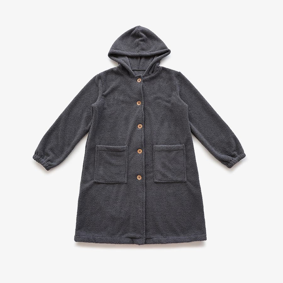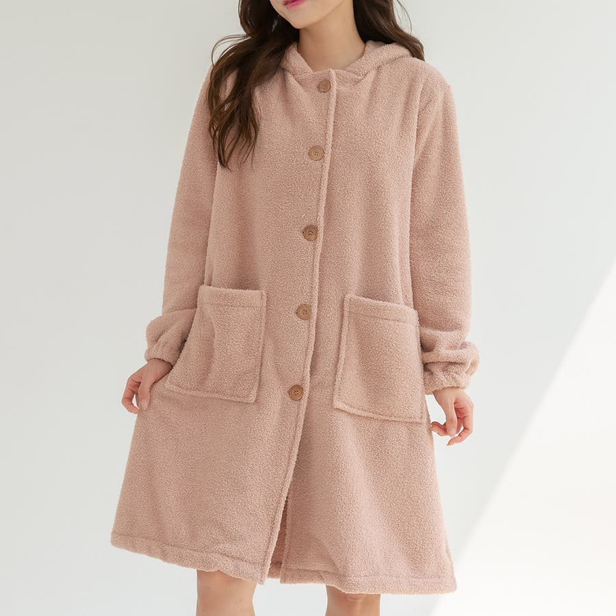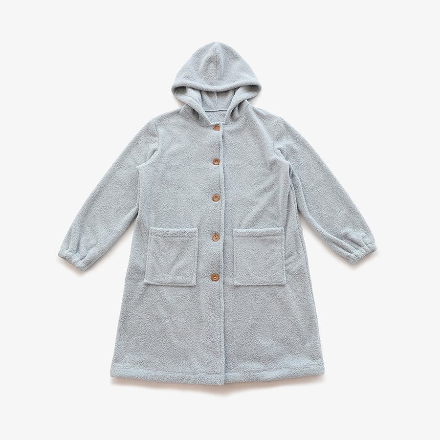 前開きボタンでさっと羽織るのにもぴったりなフード付きワンピース