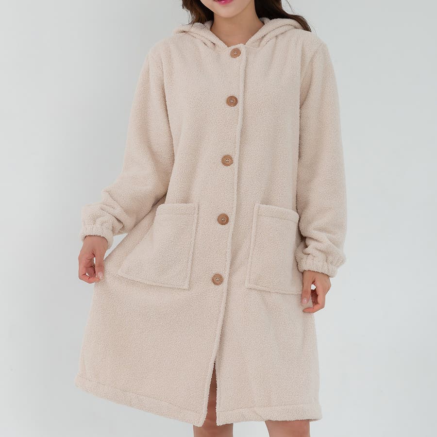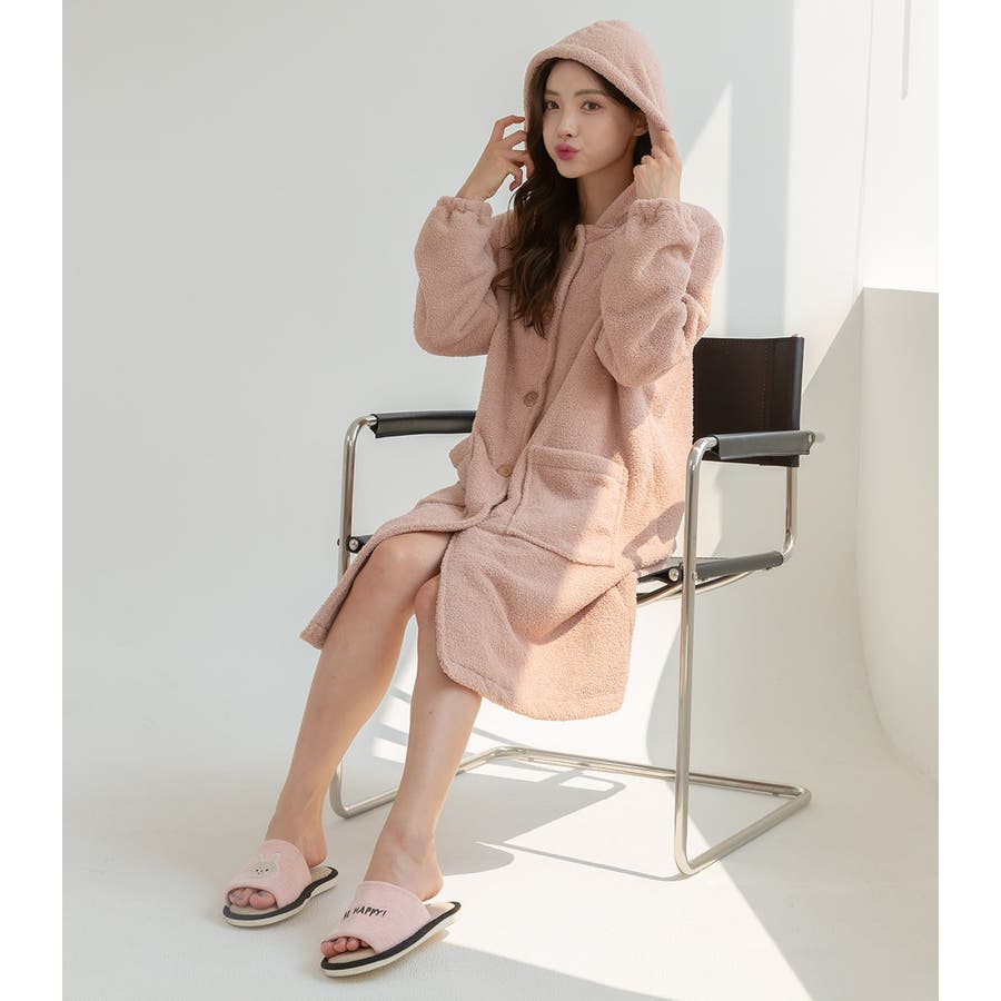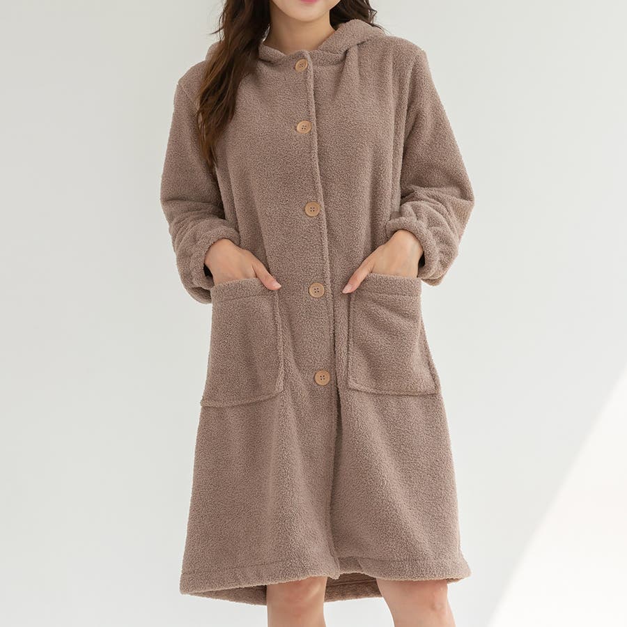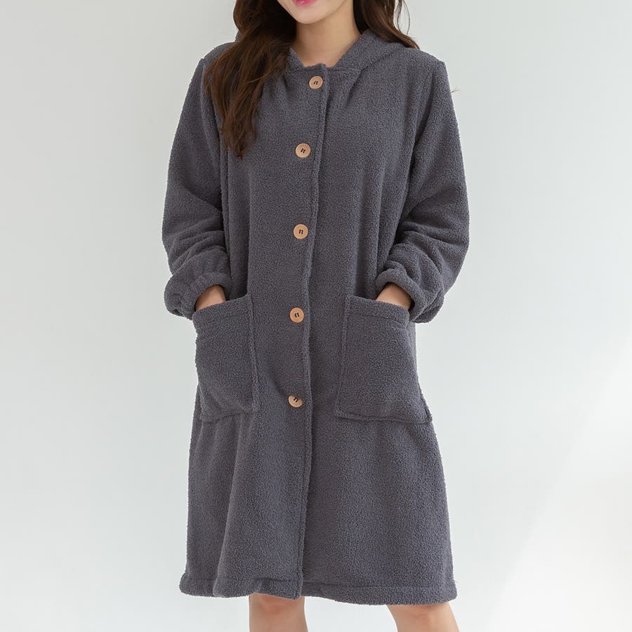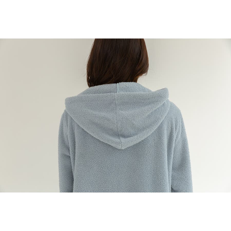 前開きボタンでさっと羽織るのにもぴったりなフード付きワンピース