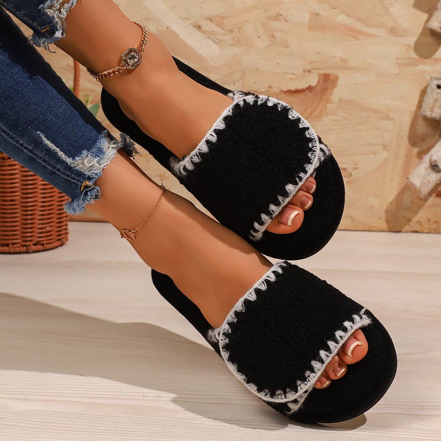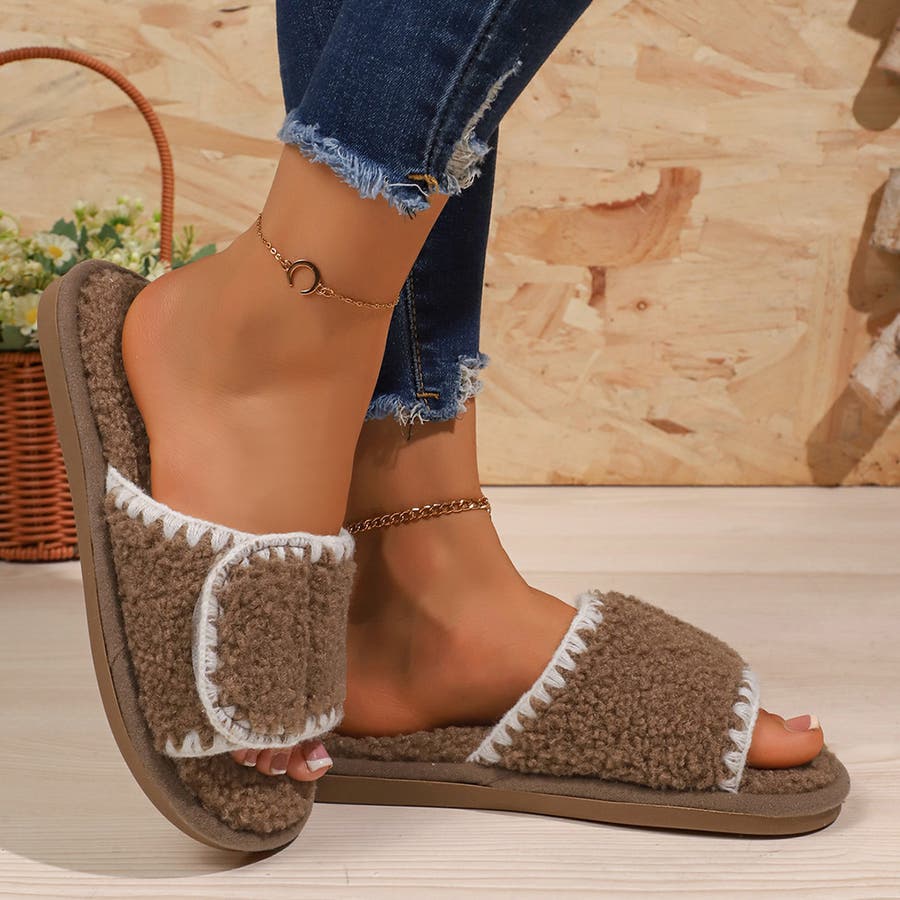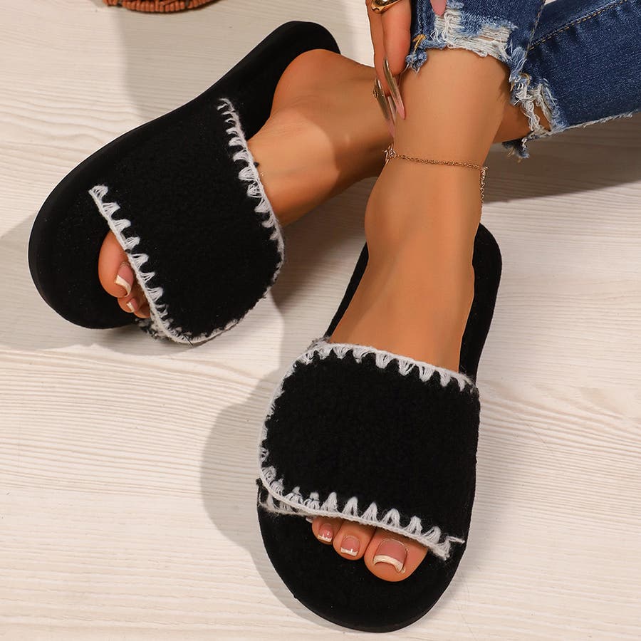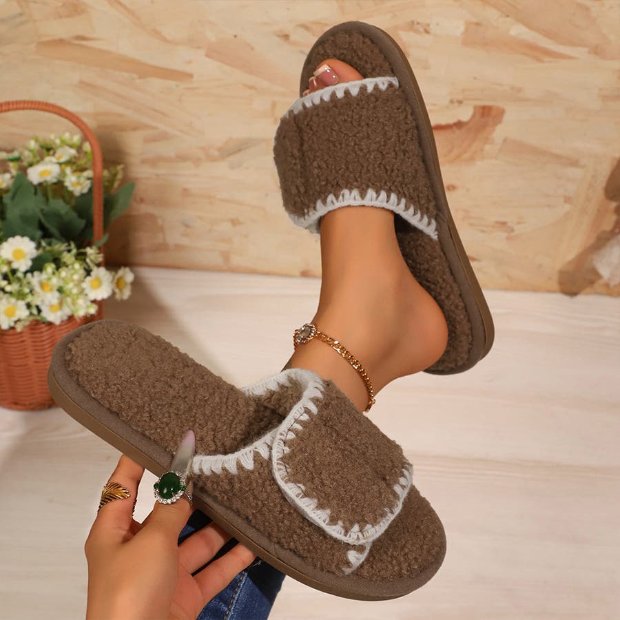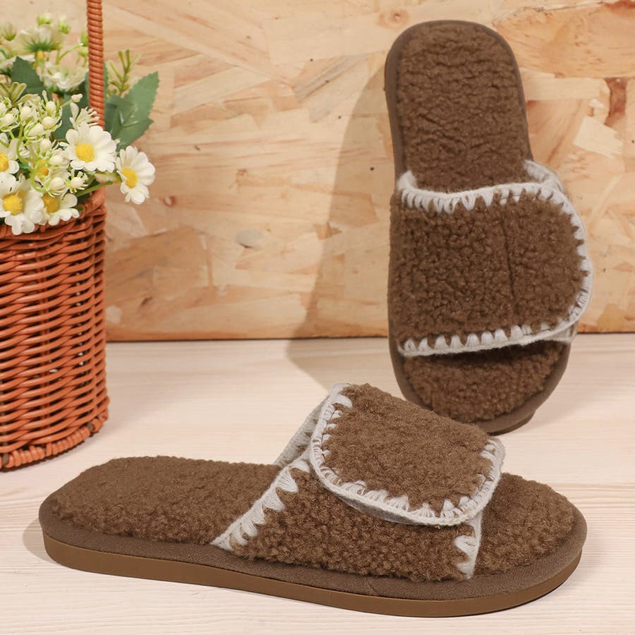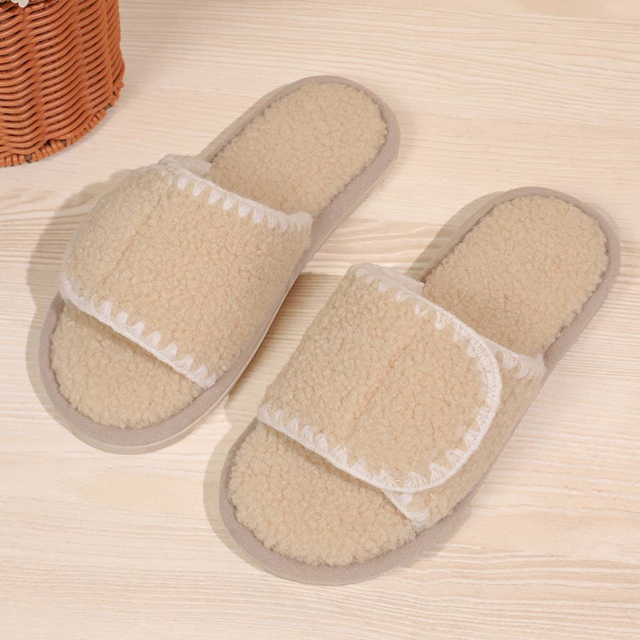 インテリアに馴染みやすいステッチ入りのボアスリッパ。