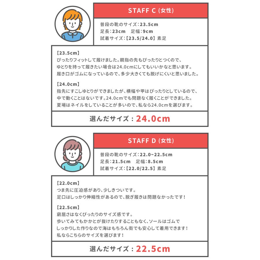 素足なら足長に対して「ぴったり」または「0.5cm大きめ」