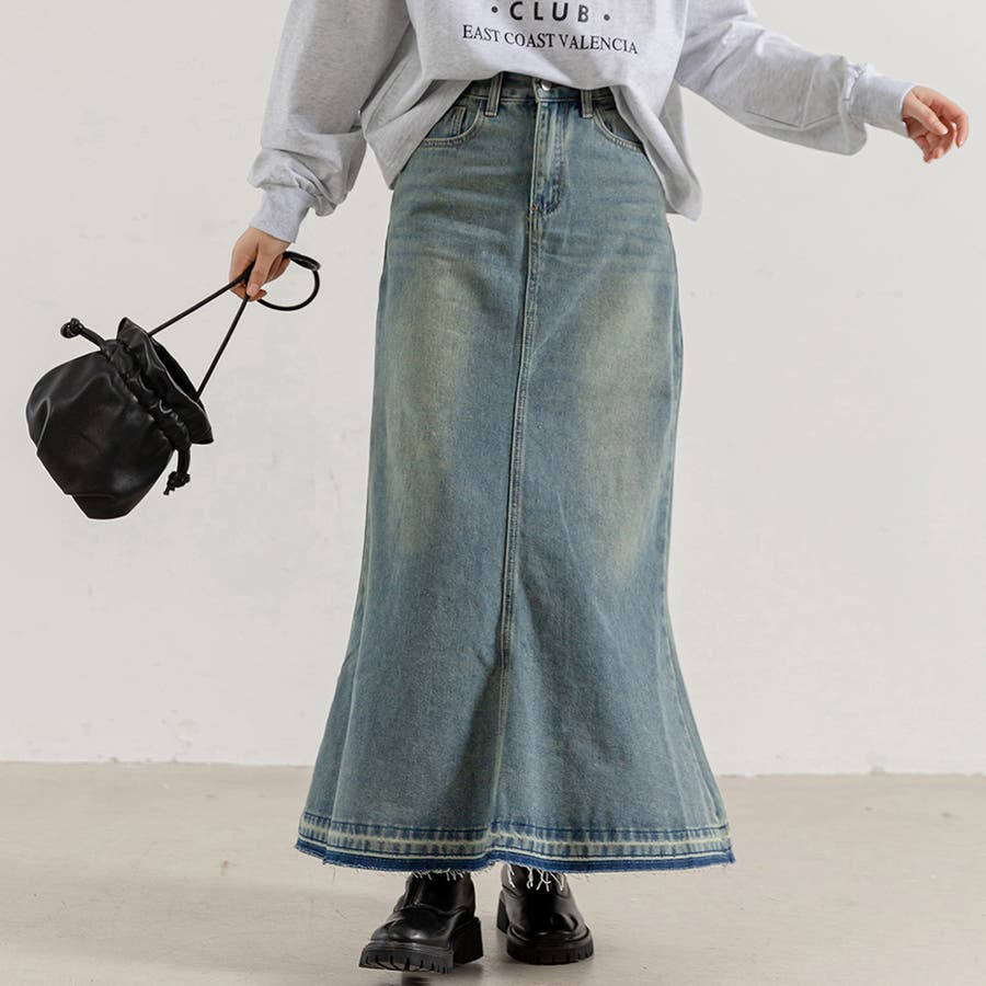裾が広がるようなマーメイドシルエット&デニム素材で
