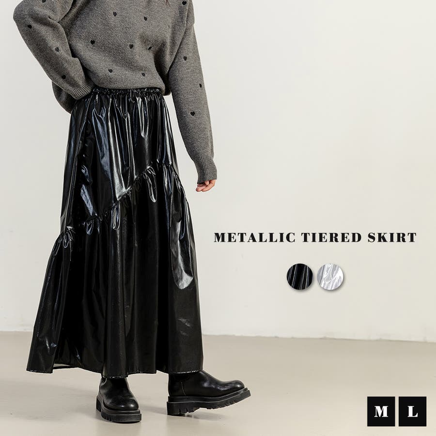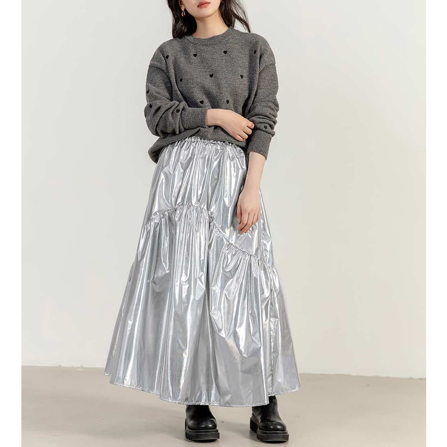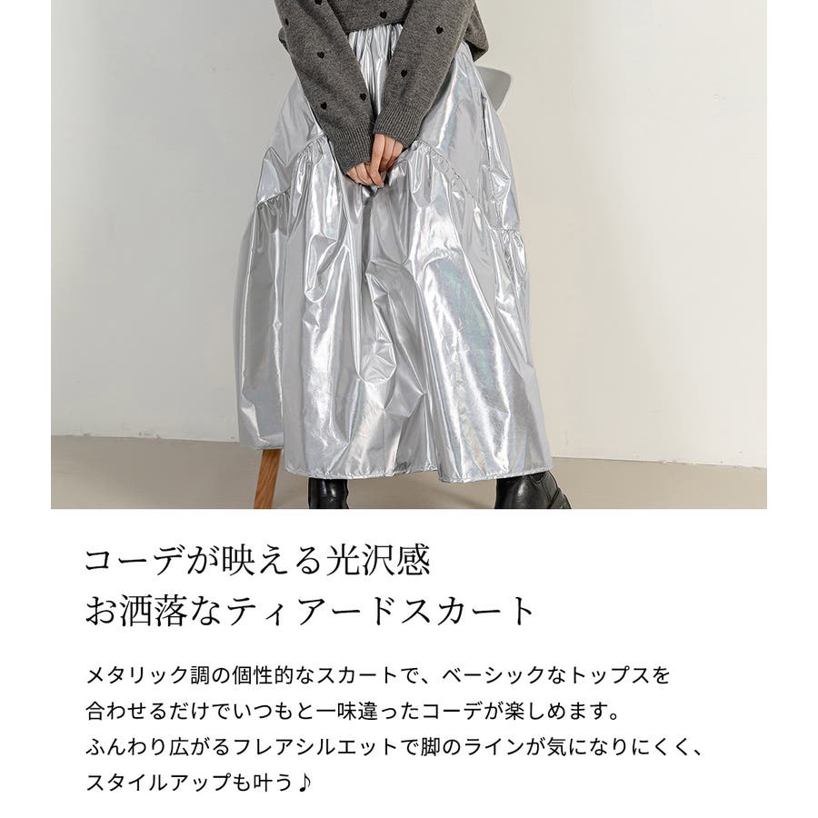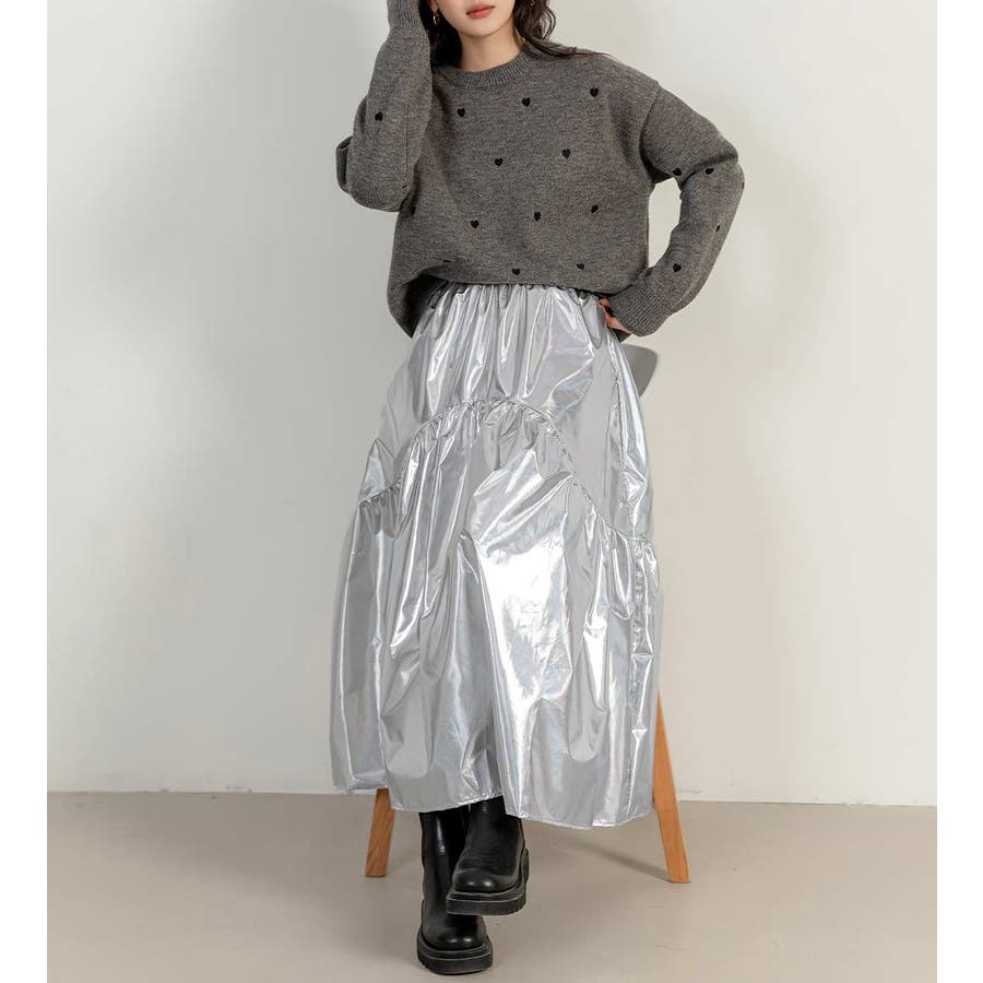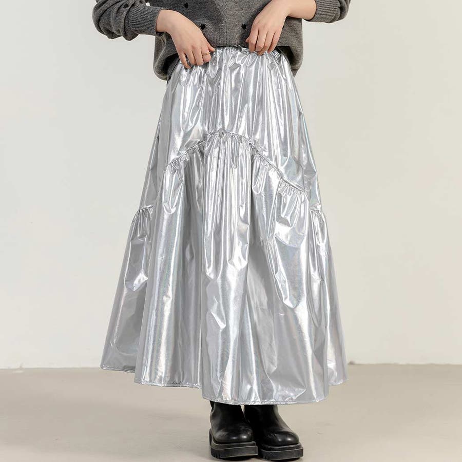 メタリック調の個性的なスカートで、ベーシックなトップスを合わせるだけで