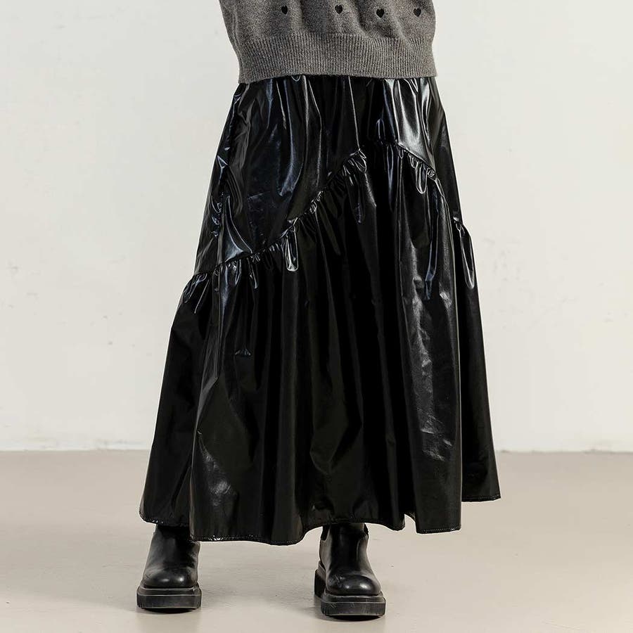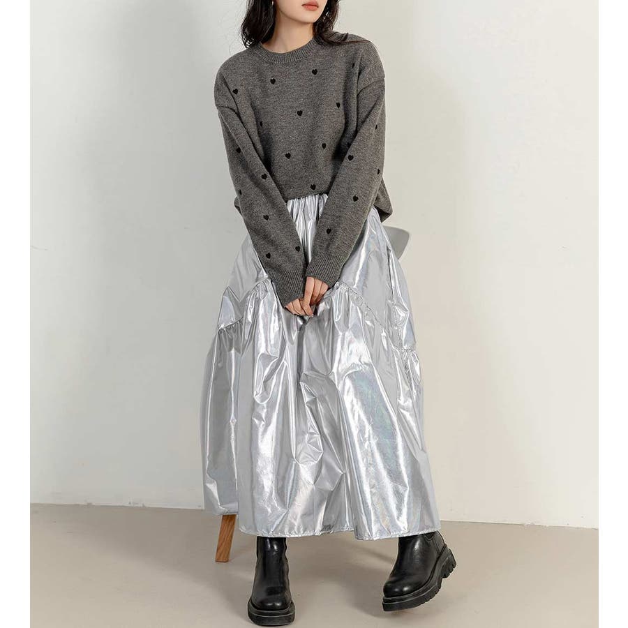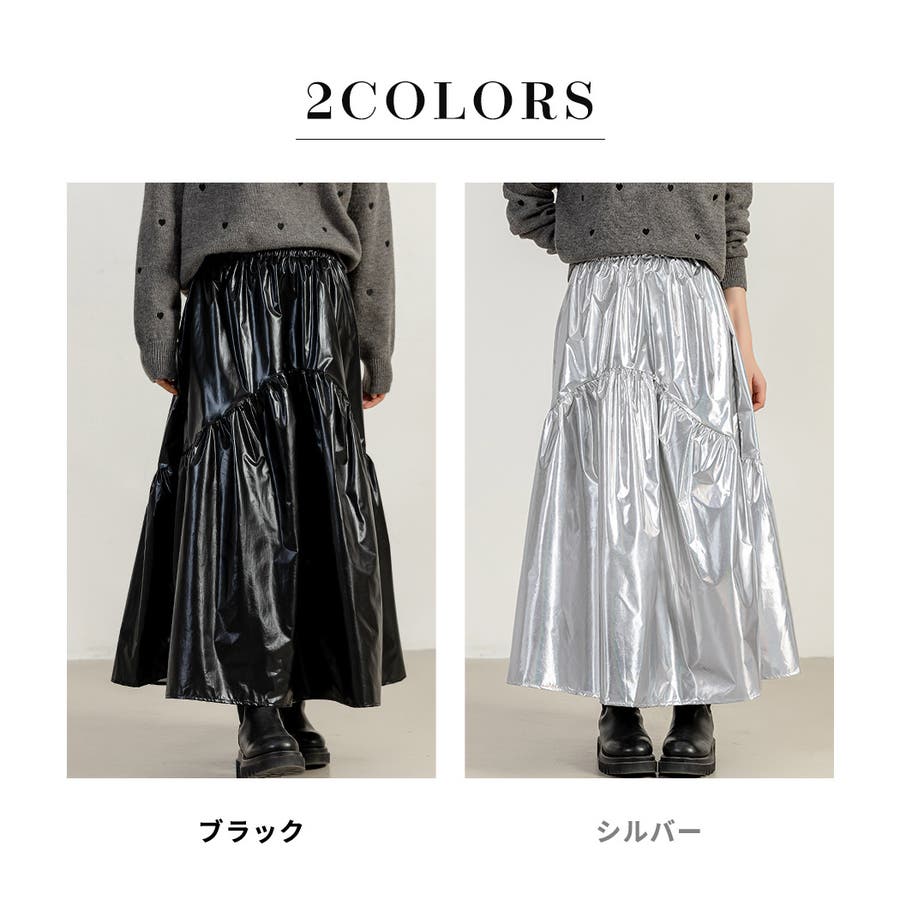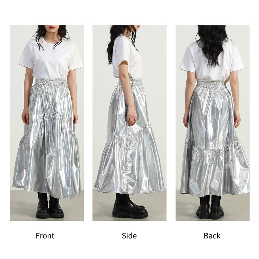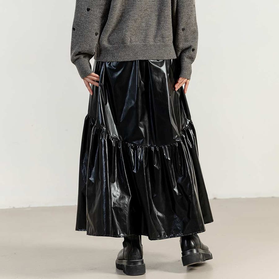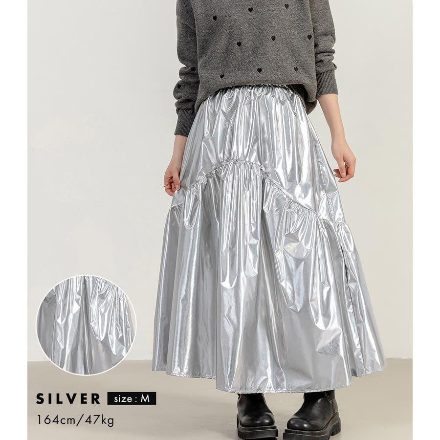 メタリック調の個性的なスカートで、ベーシックなトップスを合わせるだけで