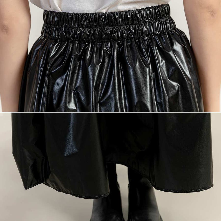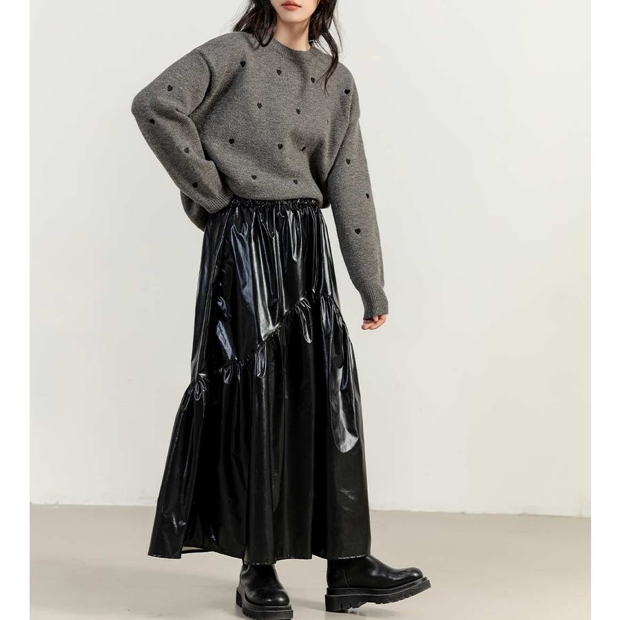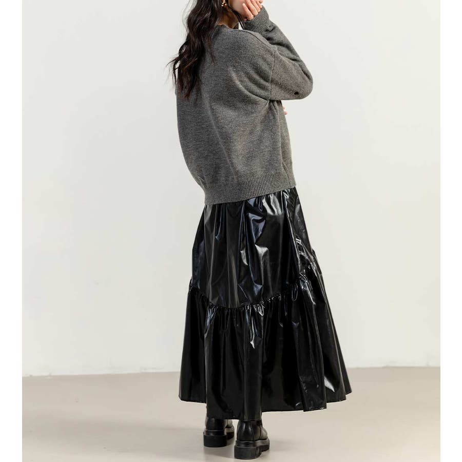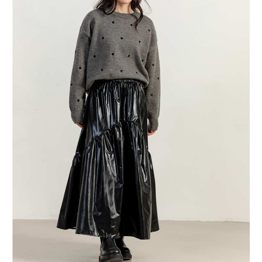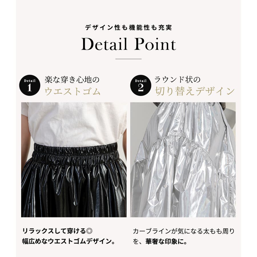 メタリック調の個性的なスカートで、ベーシックなトップスを合わせるだけで