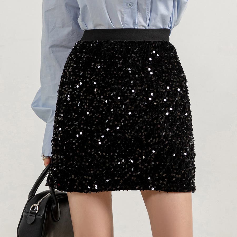 スカート全体にスパンコールがあしらわれた、存在感たっぷりのミニスカート。