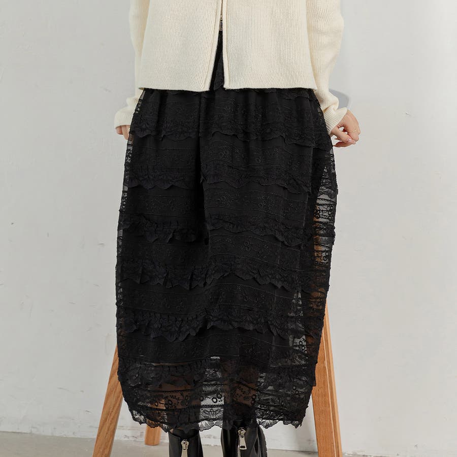 大人フェミニンなスタイリングが完成するロング丈のレースティアードスカート。