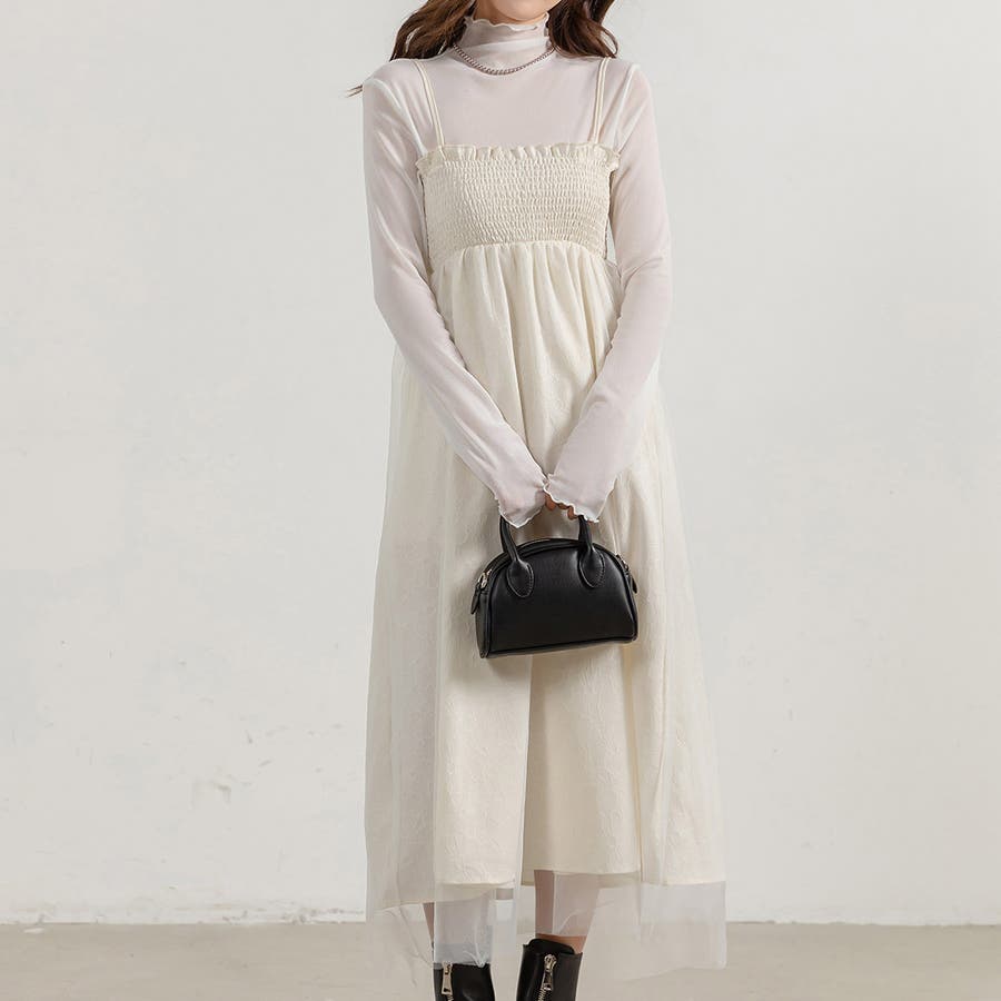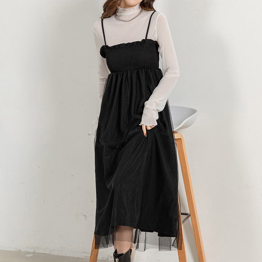 薄手のトップスを合わせたキャミワンピスタイルと、パーカーやニットを上から合わせた