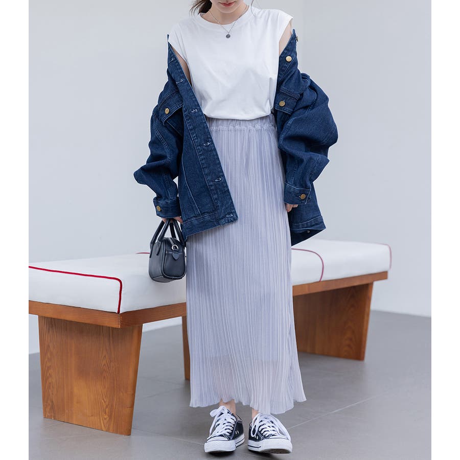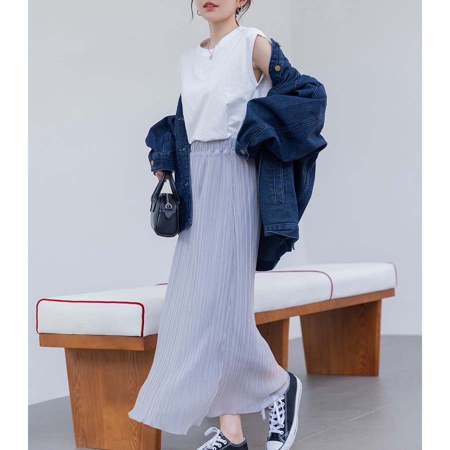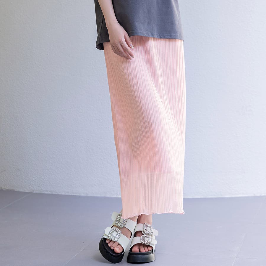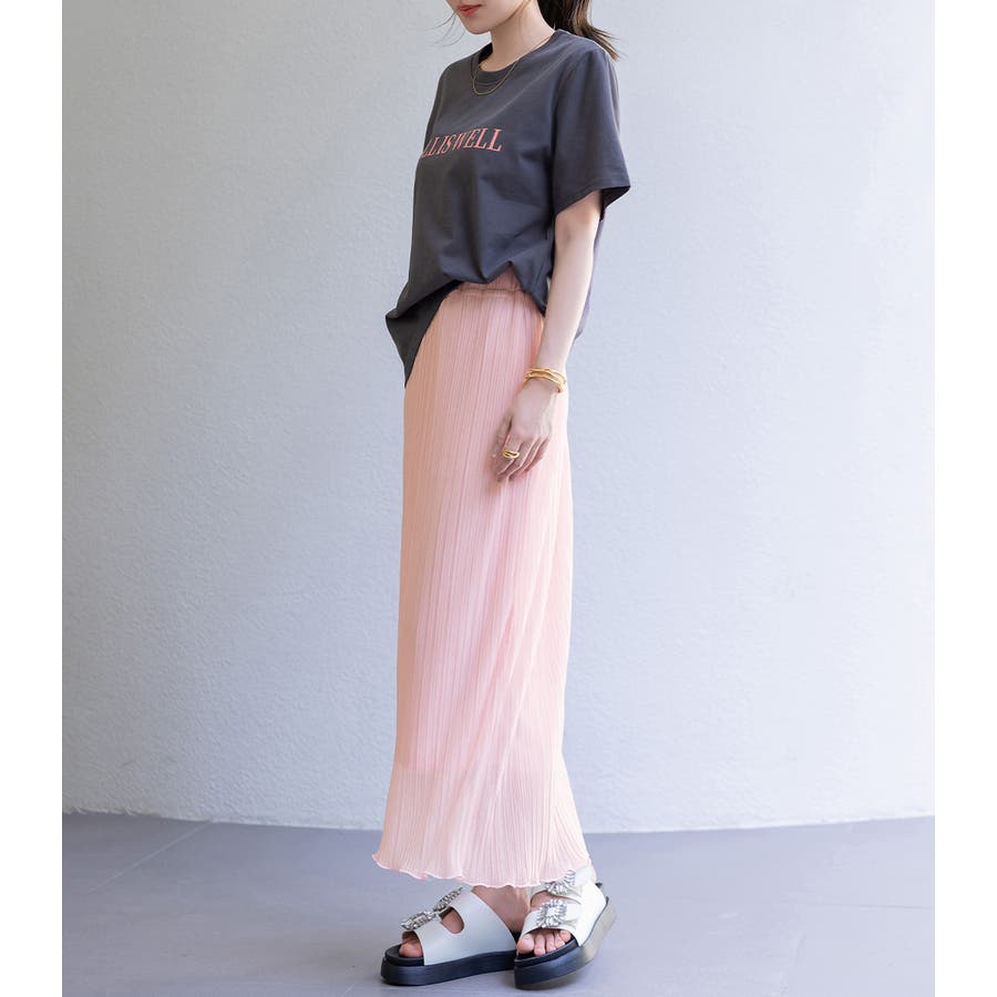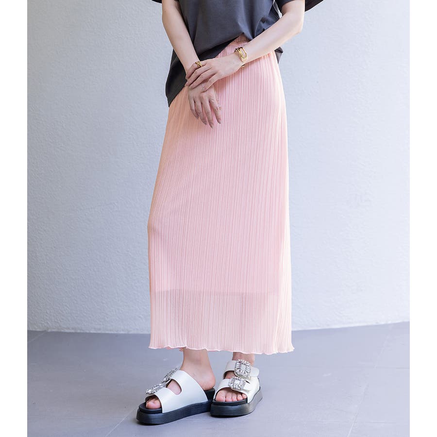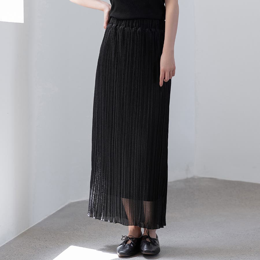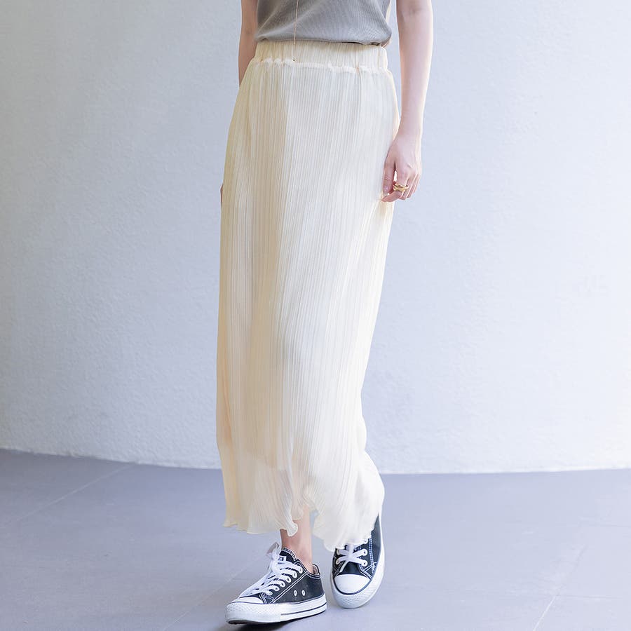 プリーツ入りでシルエットが華やかに演出され、穿くだけで大人レディなスタイリングに。