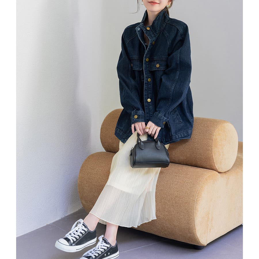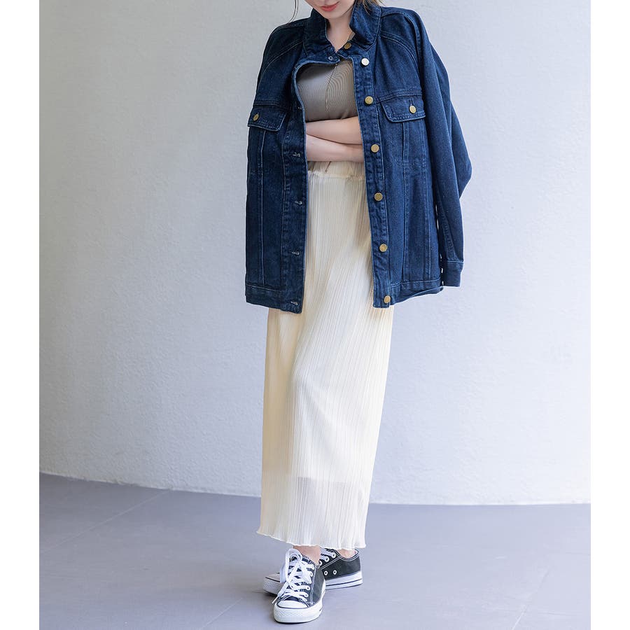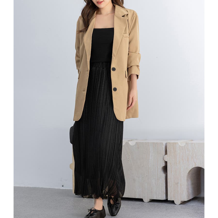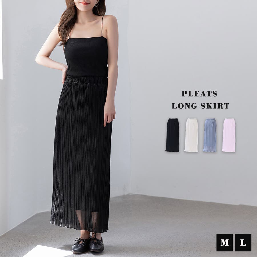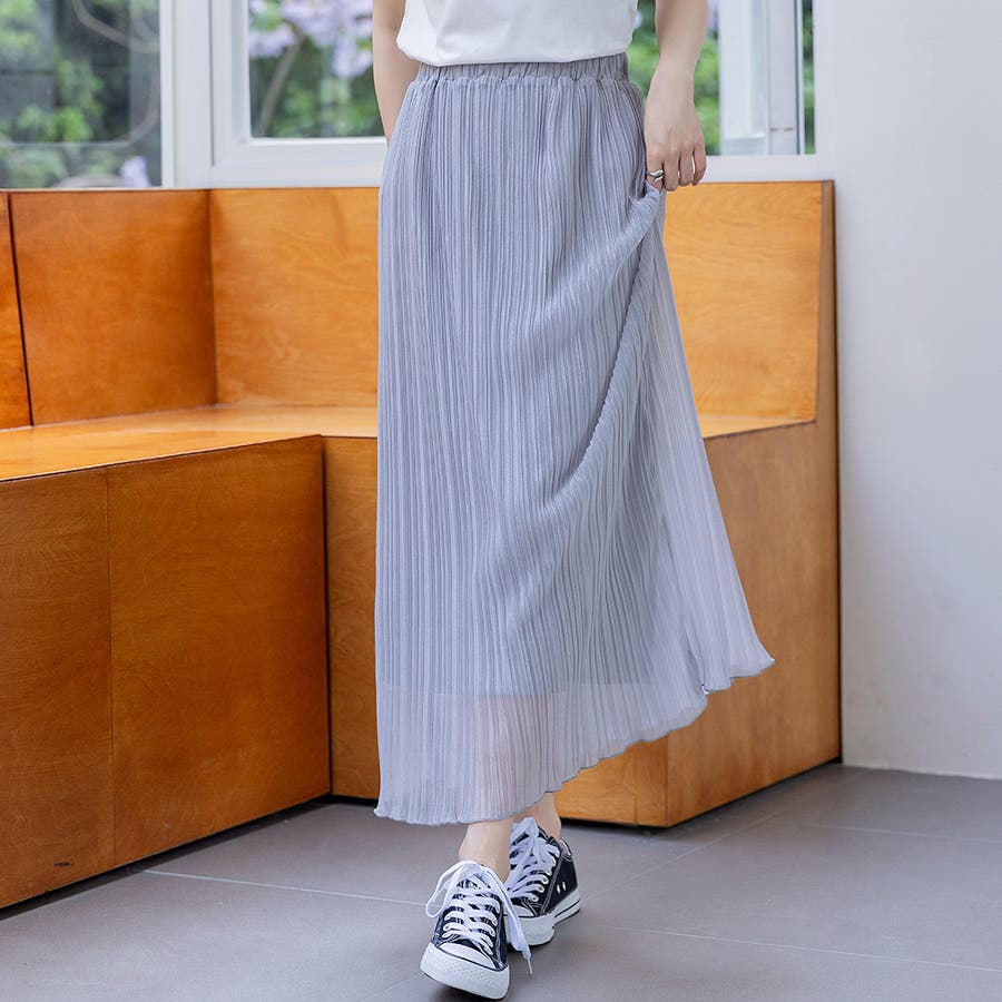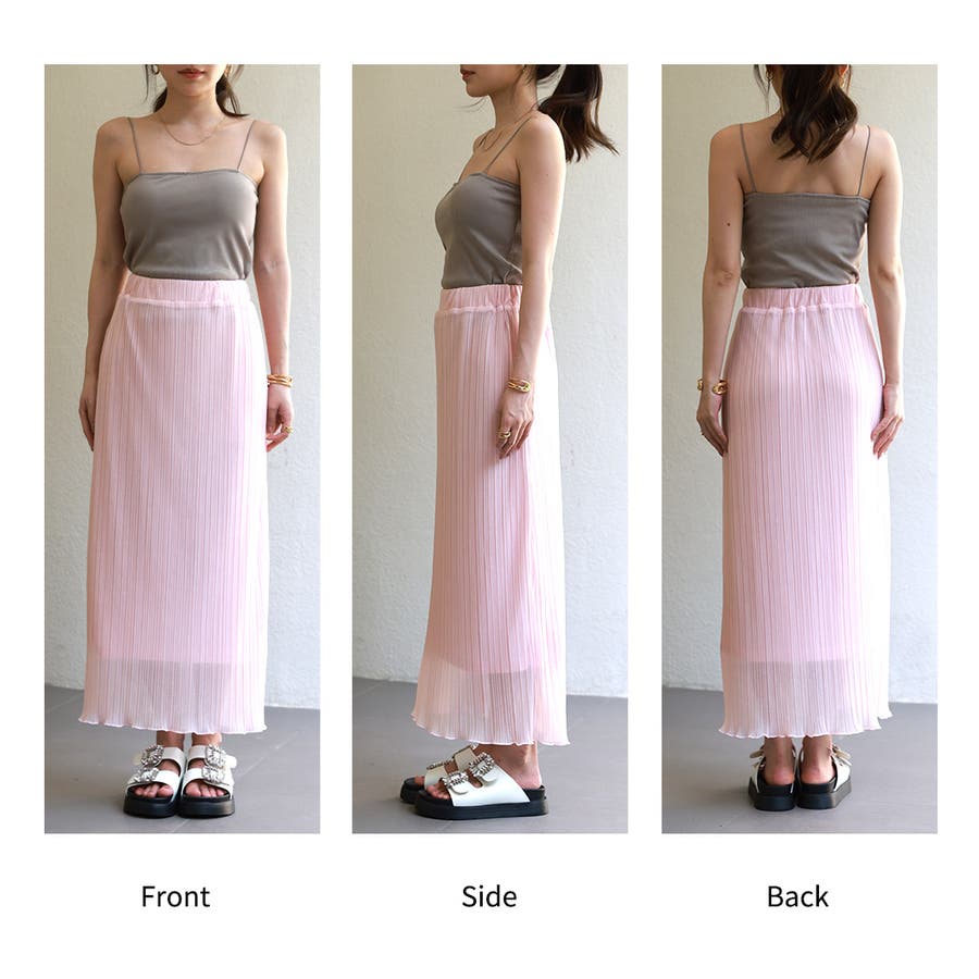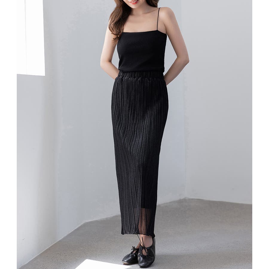プリーツ入りでシルエットが華やかに演出され、穿くだけで大人レディなスタイリングに。