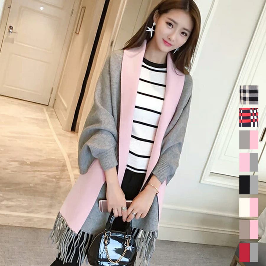 シンプル無地のストール風カーデもバイカラーで華やかさアップ