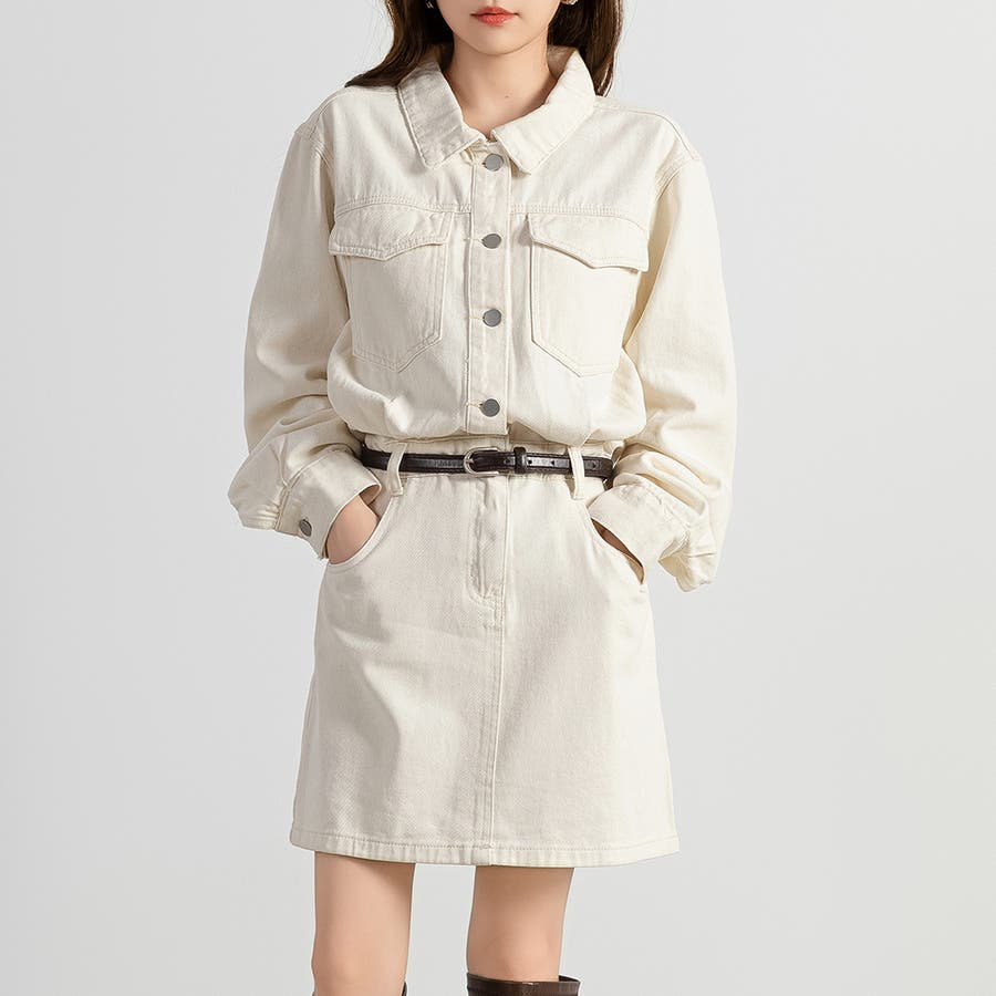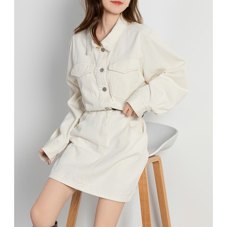 前開きボタンのトップス部分と、スカート部分のハーフジップで