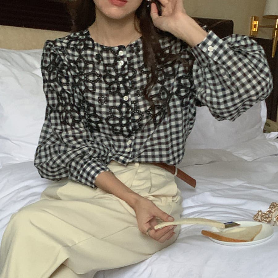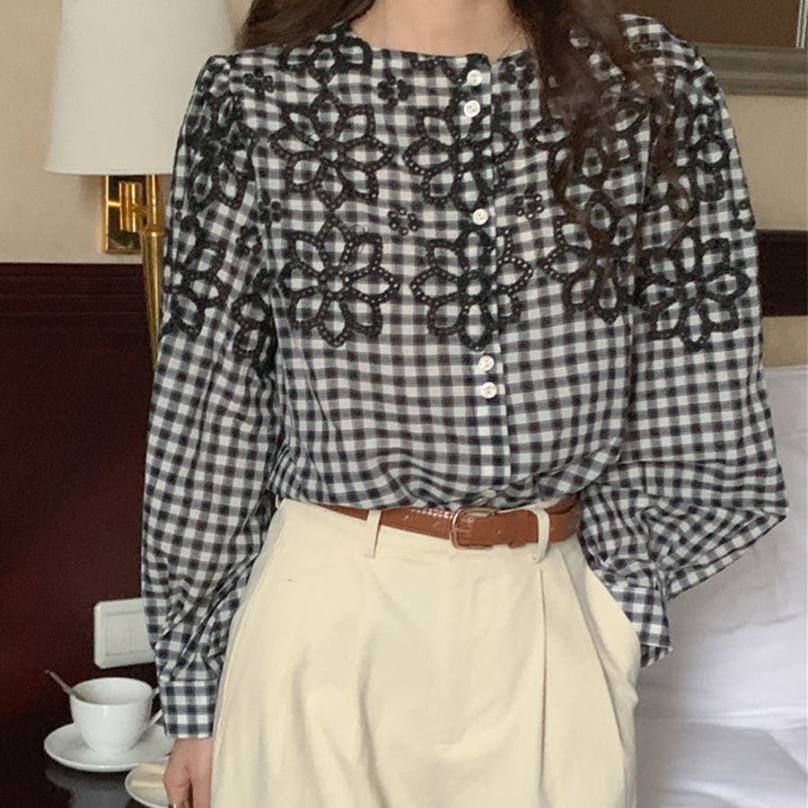 ブラウス 花柄 ギンガムチェック