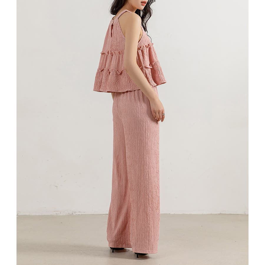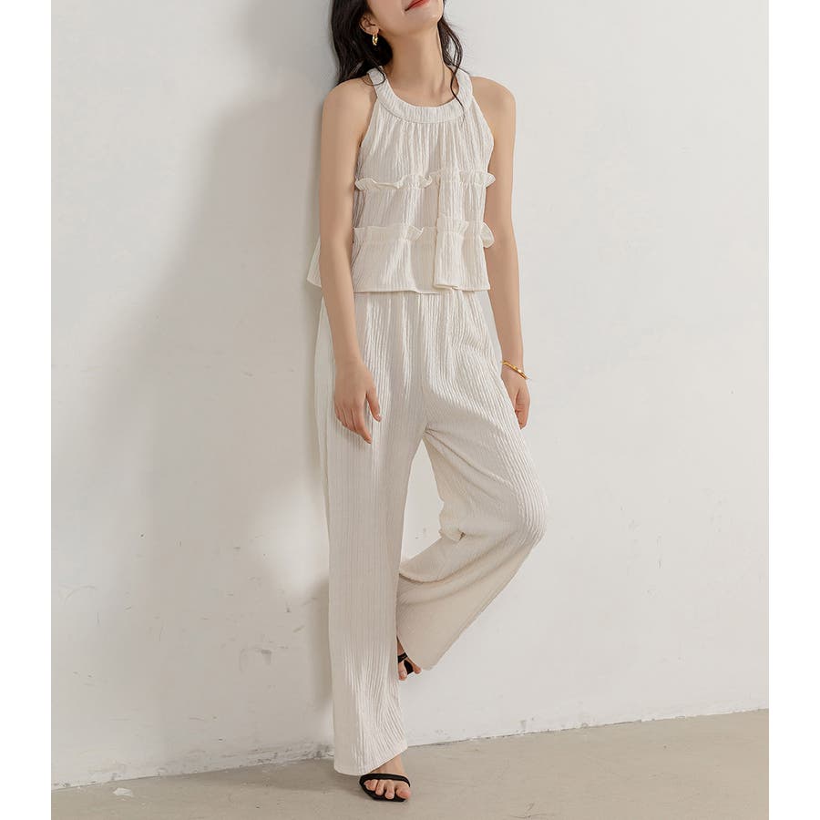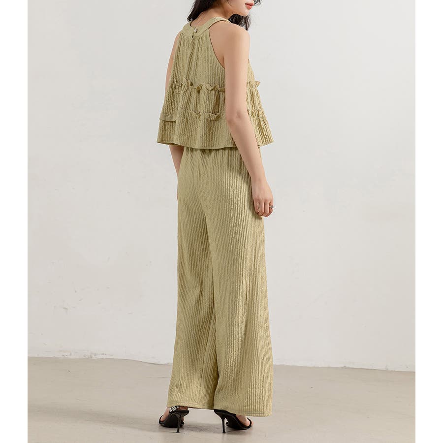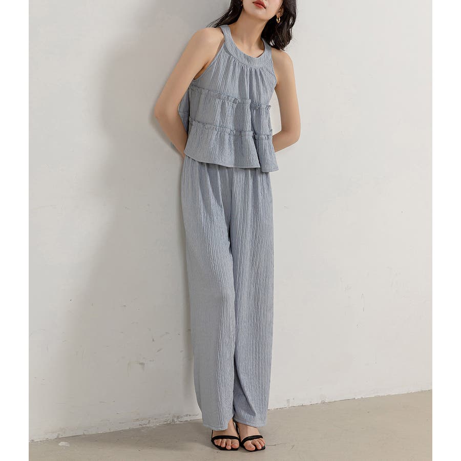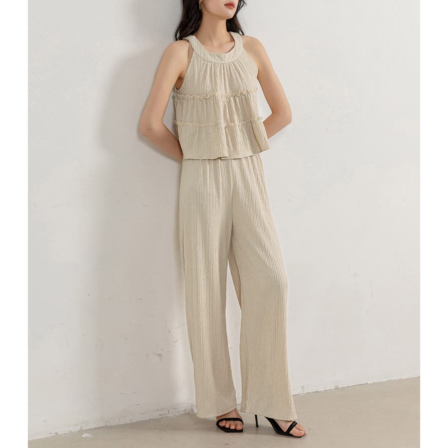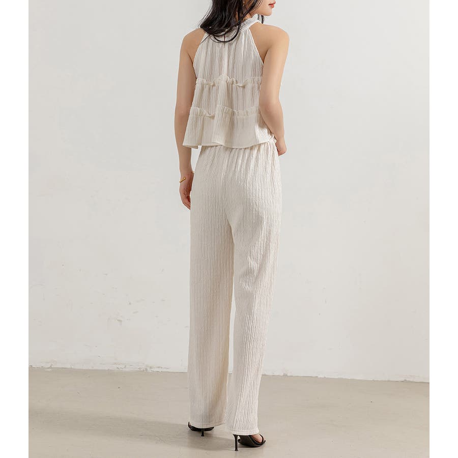 フレアトップスにワイドパンツを合わせたこなれ感のあるデザインで