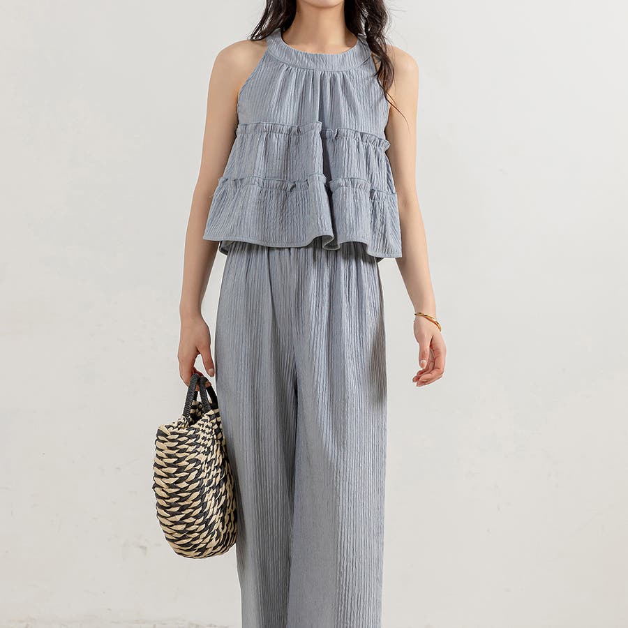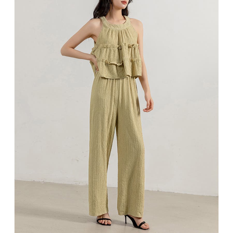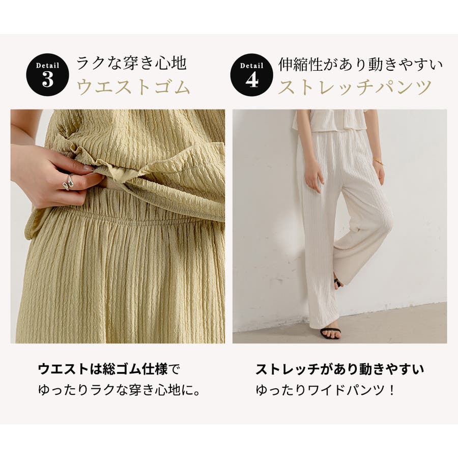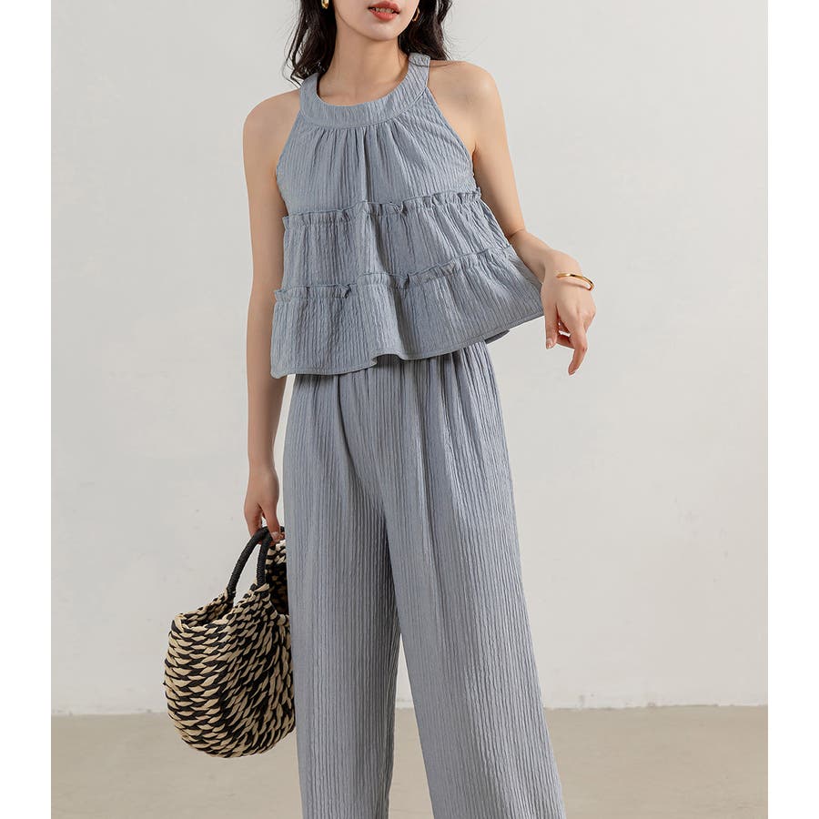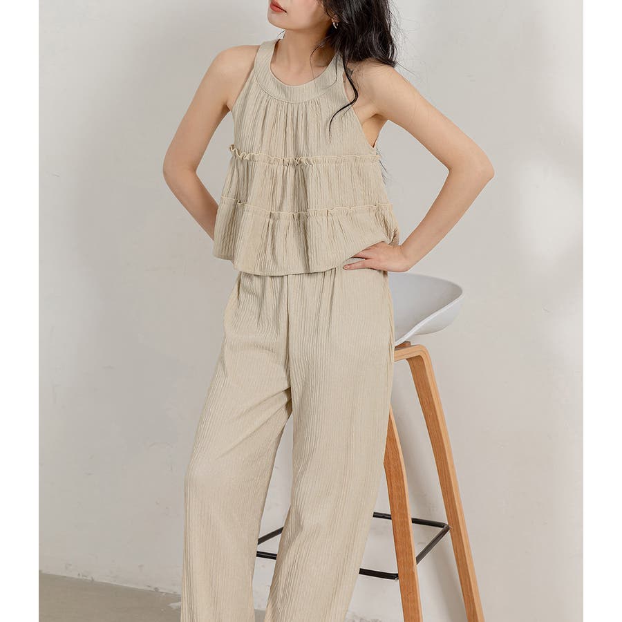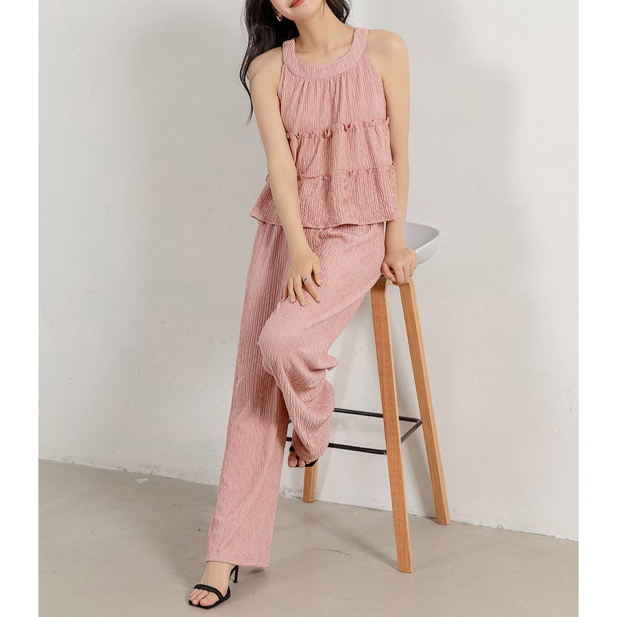 フレアトップスにワイドパンツを合わせたこなれ感のあるデザインで