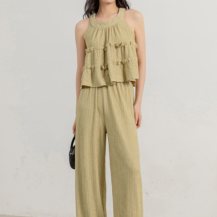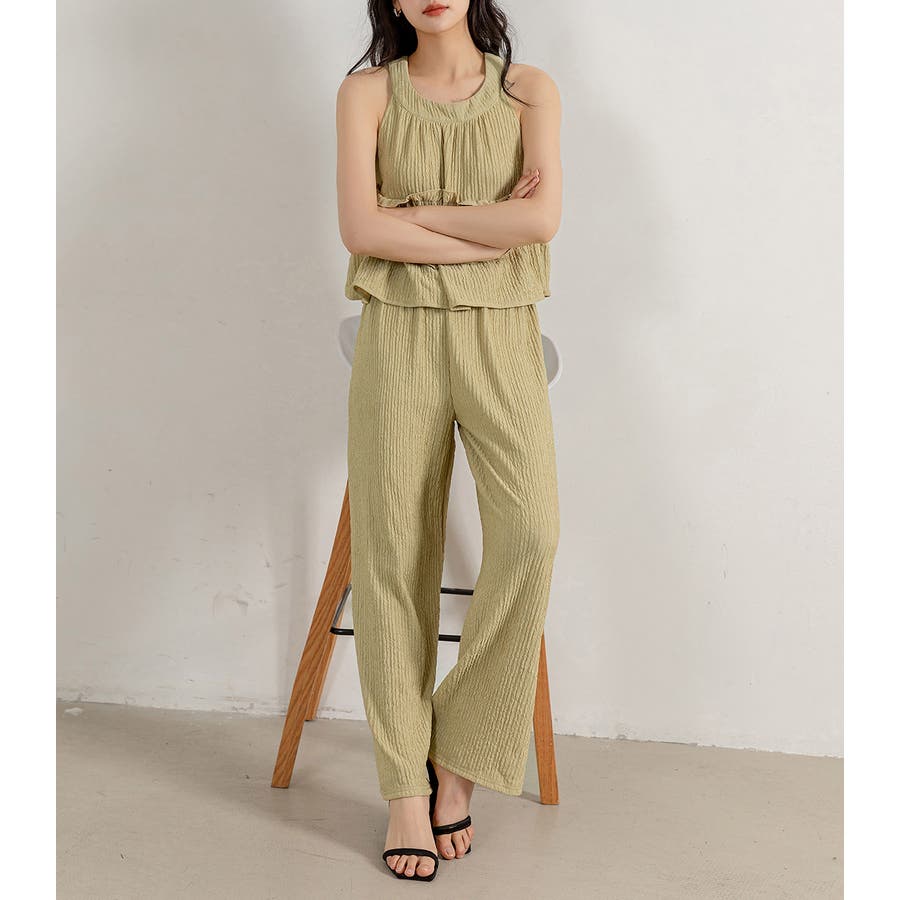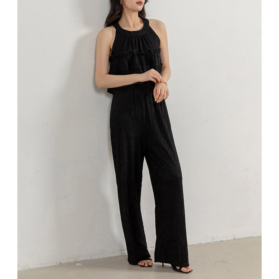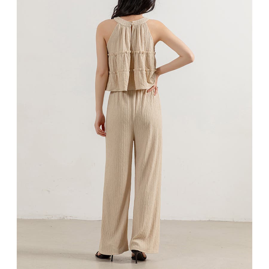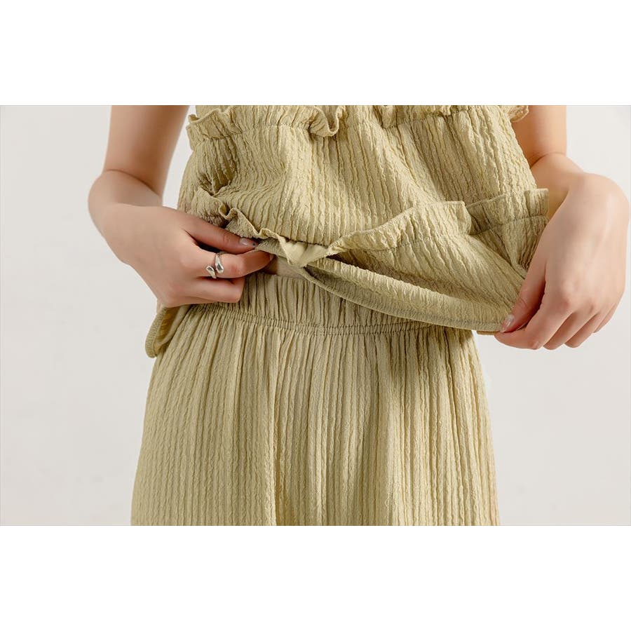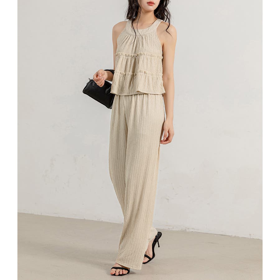 フレアトップスにワイドパンツを合わせたこなれ感のあるデザインで